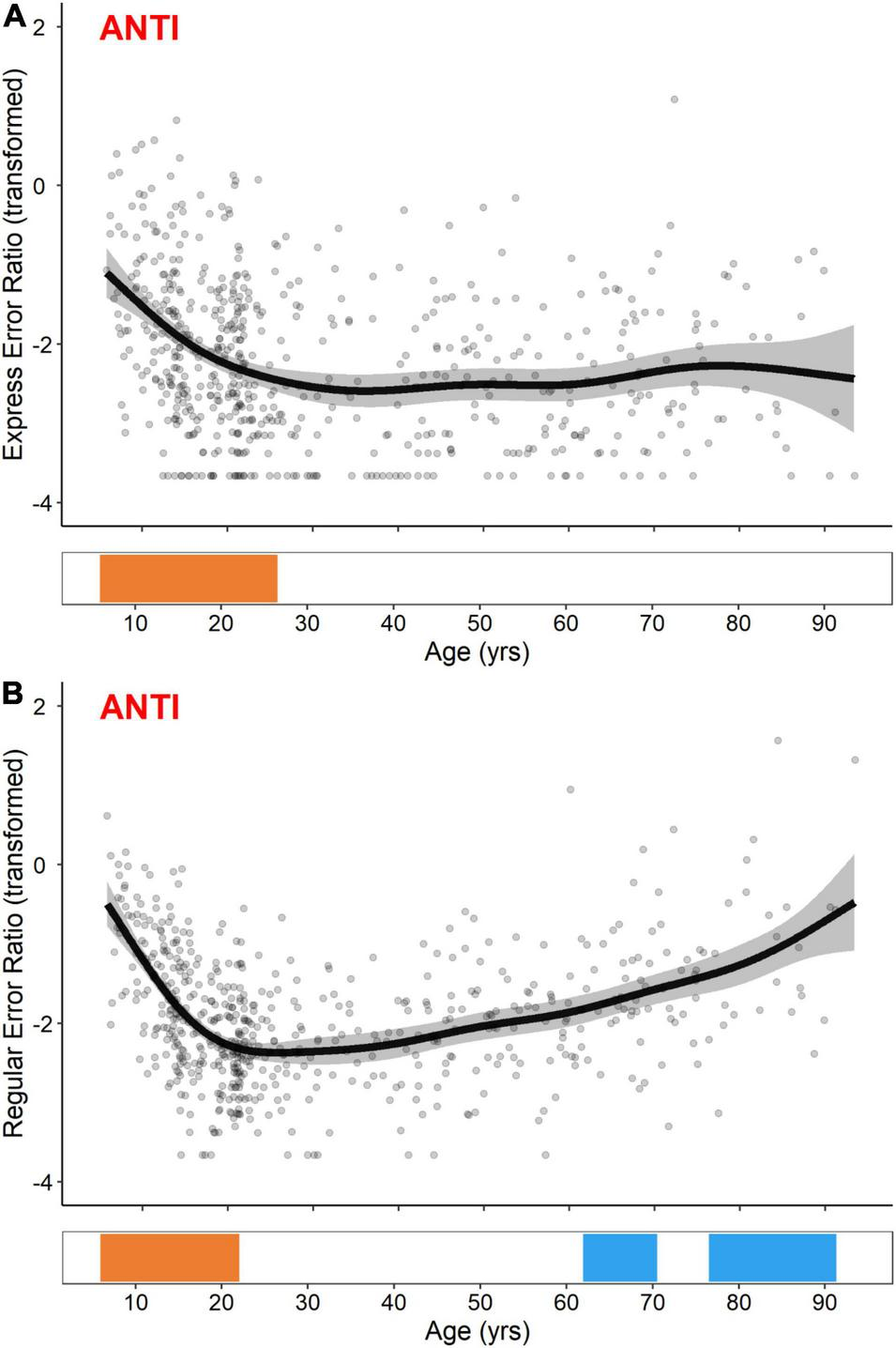 GAM fits and significant periods of change for logit transformed ANTI express-latency (A) and regular-latency (B) direction error ratios. Scatter points are individual participants, black curves are the GAM fits, and gray ribbons are the 95% confidence intervals. Bottom tiles indicate significant periods of developmental-related (orange) and aging-related (blue) change.