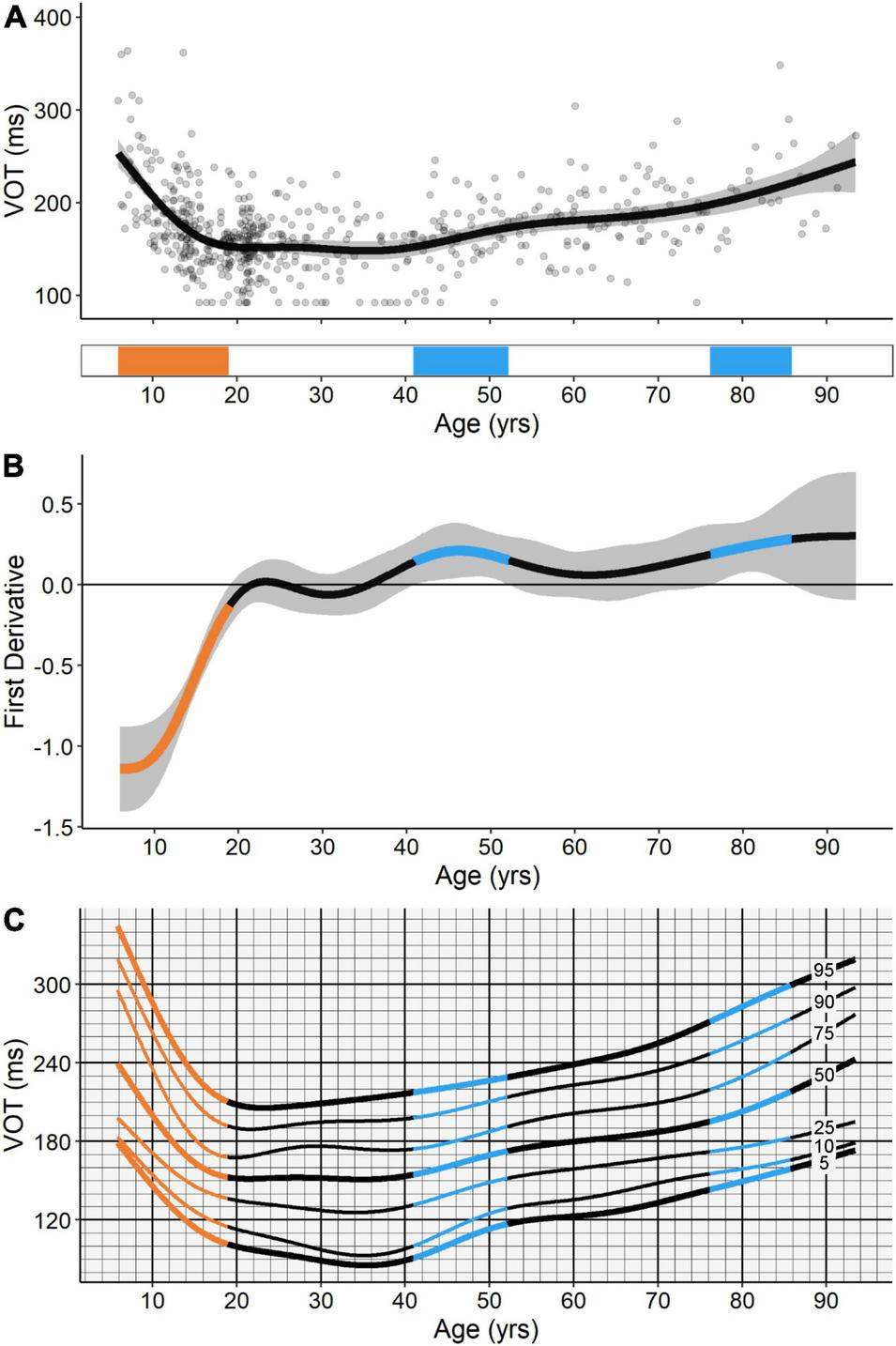 (A) GAM fit and significant periods of change for voluntary override time (VOT). Scatter points are individual participants, black curve is the GAM fit, and gray ribbon is the 95% confidence interval. Bottom tile indicates significant periods of developmental-related (orange) and aging-related (blue) change. (B) First derivative of the GAM fit shown in panel (A). Negative values indicate improvements in task performance (i.e., decreases in VOT) and positive values indicate declines in task performance (i.e., increases in VOT). Significant periods of developmental-related (orange) and aging-related (blue) change were identified at the ages where the confidence intervals of the first derivative of the GAM did not contain zero (p < 0.05). (C) A hypothetical “cognitive growth curve” for VOT consisting of the 5th, 10th, 25th, 50th, 75th, 90th, and 95th percentile curves for the measure.