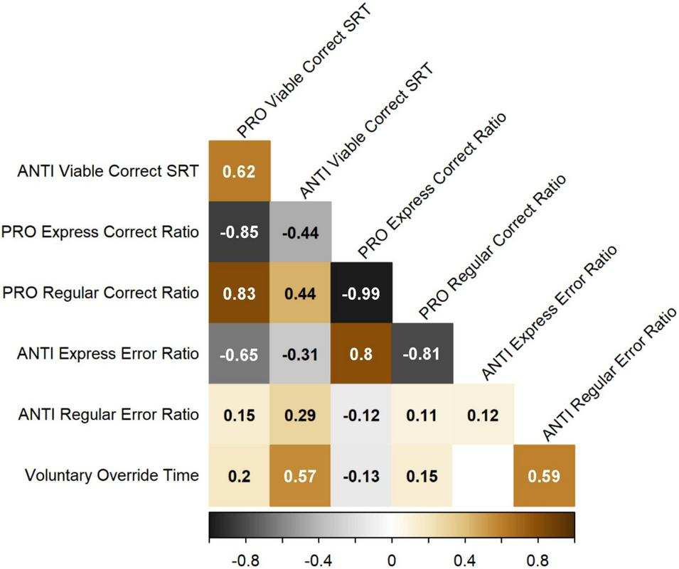 Standardized residuals derived from each of the GAMs described above were input into Spearman’s correlations to investigate the pairwise relationships between measures after controlling for age (Figure 7). PRO and ANTI viable correct SRT were positively correlated with one another. PRO and ANTI SRT were also both positively correlated with PRO regular-latency correct response ratio and ANTI regular-latency direction error ratio, and negatively correlated with PRO express-latency correct response ratio and ANTI express-latency direction error ratio. PRO express-latency correct response ratio was negatively correlated with PRO regular-latency correct response ratio, and positively correlated with ANTI express-latency direction error ratio. Finally, VOT was positively correlated with both ANTI viable correct SRT and ANTI regular-latency direction error ratio, as expected. All reported correlations were statistically significant (p < 0.05).