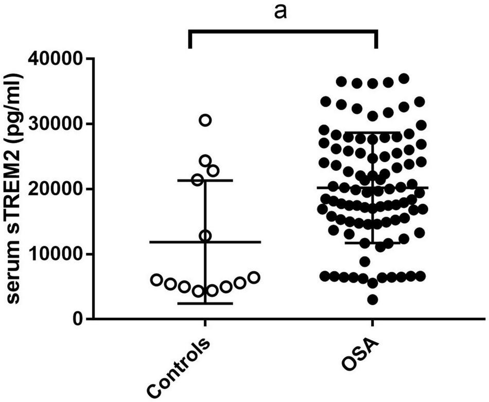 The sTREM2 level in control group and OSA group. The comparison was evaluated by covariance analysis; a, compared with the control group, p < 0.05. OSA, obstructive sleep apnea; sTREM2, soluble triggering receptor expressed on myeloid cells 2.