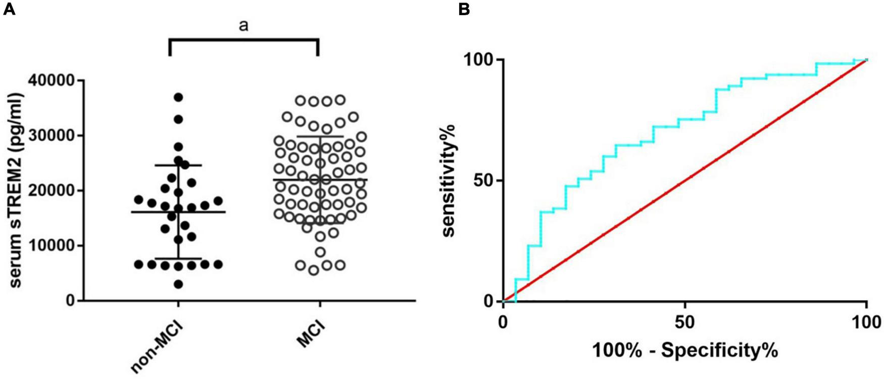 The sTREM2 level in OSA patients with and without MCI (A) and the ROC curve analysis of serum sTREM2 in discriminating OSA patients with MCI from those without (B). The comparison was evaluated by t-test; a, compared with the control group, p < 0.05. MCI, mild cognitive impairment; OSA, obstructive sleep apnea; ROC, receiver operating characteristic; sTREM2, soluble triggering receptor expressed on myeloid cells 2.
