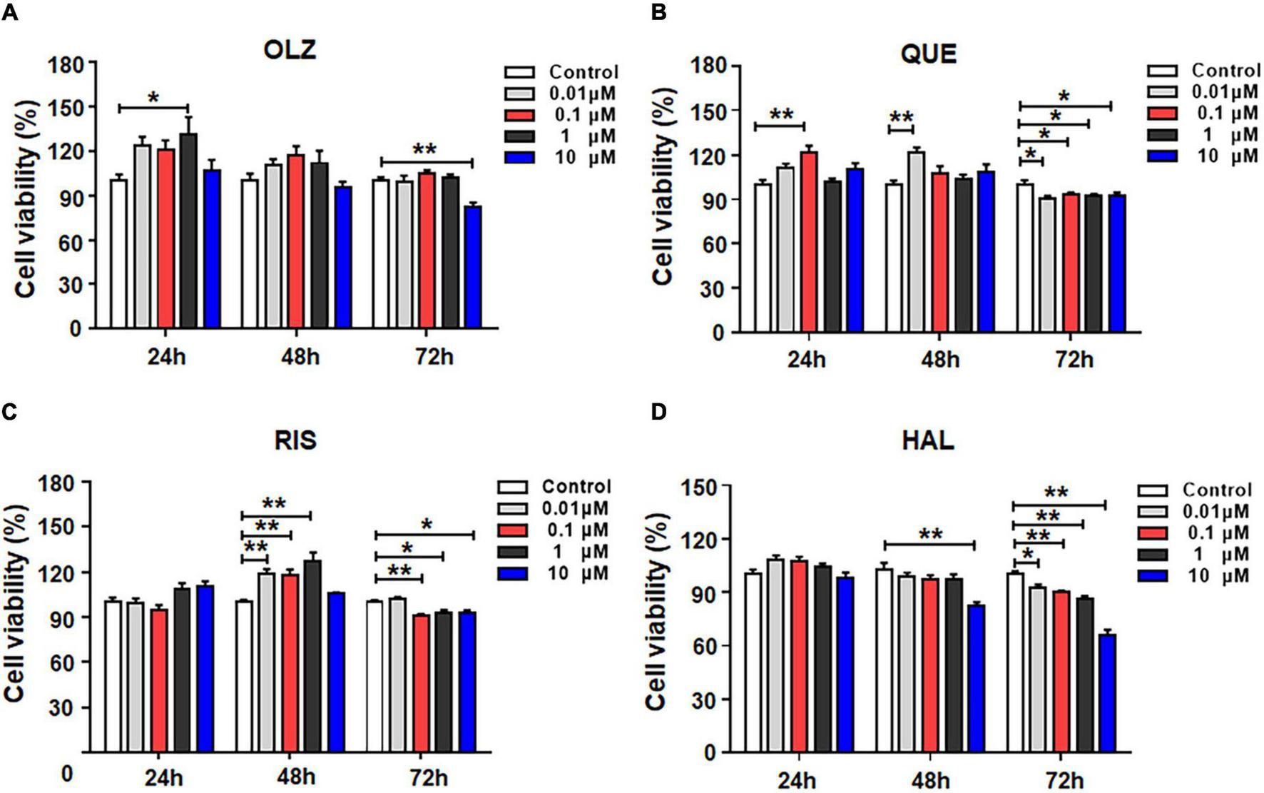 To test the effects of olanzapine, quetiapine, risperidone, and haloperidol on the viability of astrocytes, 5 × 103 cells/well were seeded on 96-well plates. The cells were divided into five groups, which were treated with vehicle or antipsychotic drugs at 0.01, 0.1, 1, or 10 μM. After 24-, 48-, or 72-h treatment, a cell counting kit 8 (cck8) (DOJINDO, Beijing, China, CK04) was used to determine cell viability. Antipsychotics including olanzapine, quetiapine, risperidone, and haloperidol were dissolved in dimethyl sulfoxide (DMSO) (Sigma-Aldrich, St. Louis, MO, United States, D2650) to prepare 10 mM stock solutions. They were subsequently diluted with DMEM to 0.01, 0.1, 1, or 10 μM before use. Control cells were treated with DMEM + DMSO (vehicle).
