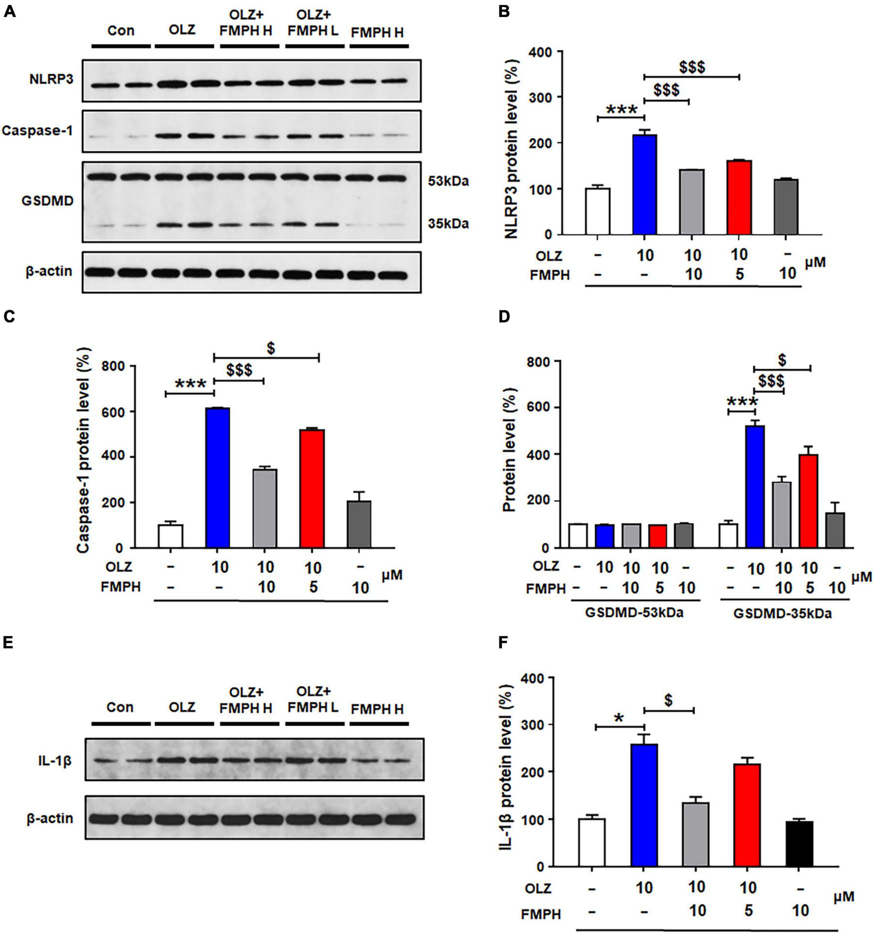 2-(3-Trifluoromethylphenyl) histamine (FMPH) co-treatment inhibited olanzapine-induced NLRP3/caspase-1 signaling activation and reduced IL-1β protein expression in cultured astrocytes. (A–F) Cultured cells were treated with vehicle [dimethyl sulfoxide (DMSO) + water], olanzapine 10 μM, olanzapine 10 μM + FMPH 10 μM, olanzapine 10 μM + FMPH 5 μM, or FMPH 10 μM for 24 h. Western blot was used to examine the expression of NLRP3, caspase-1 (20 kDa), GSDMD (53 and 35 kDa), and IL-1β. The data are presented as the mean ± standard error of the mean. *p < 0.05, ***p < 0.001 vs. Con; $p < 0.05, $$$p < 0.001 vs. OLZ (one-way analysis of variance and post hoc Dunnett’s multiple comparison test; n = 4 cultures/western blot group). Con, control; OLZ, olanzapine; OLZ + FMPH H, olanzapine + FMPH high dose; OLZ + FMPH L, olanzapine + FMPH low dose; FMPH H, FMPH high dose.