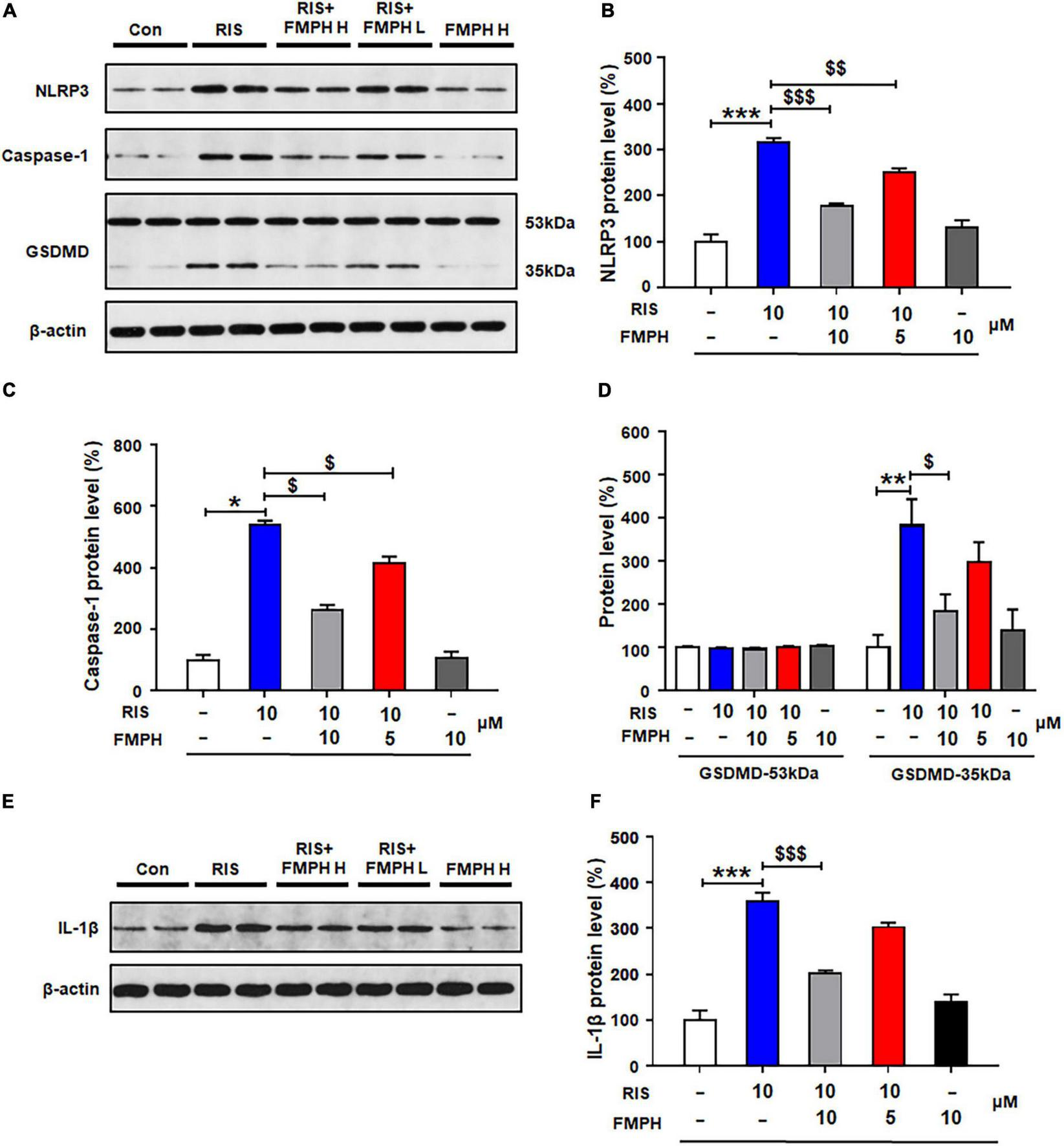 Compared with vehicle, 24-h risperidone treatment significantly upregulated NLRP3 (by 215.1 ± 10.6%, p = 0.000), caspase-1 (by 402.4 ± 17.4%, p = 0.021), GSDMD 35 kDa (by 281.6 ± 61.7%, p = 0.002), and IL-1β (by 259.3 ± 18.4%, p = 0.000) (Figures 8A–F). Co-treatment with either FMPH high or low dose ameliorated the risperidone-induced increased expression of NLRP3 (high dose, by 136.2 ± 4.6%, p = 0.000; low dose, by 63.3 ± 8.1%, p = 0.006), caspase-1 (high dose, by 200.8 ± 11.1%, p = 0.021; low dose, by 85.3 ± 13.4%, p = 0.021), GSDMD 35 kDa (high dose, by 198.0 ± 38.7%, p = 0.028; low dose, by 85.5 ± 47.2%, p = 0.513), and IL-1β (high dose, by 157.2 ± 6.0%, p = 0.000; low dose, by 57.1 ± 10.3%, p = 0.000).