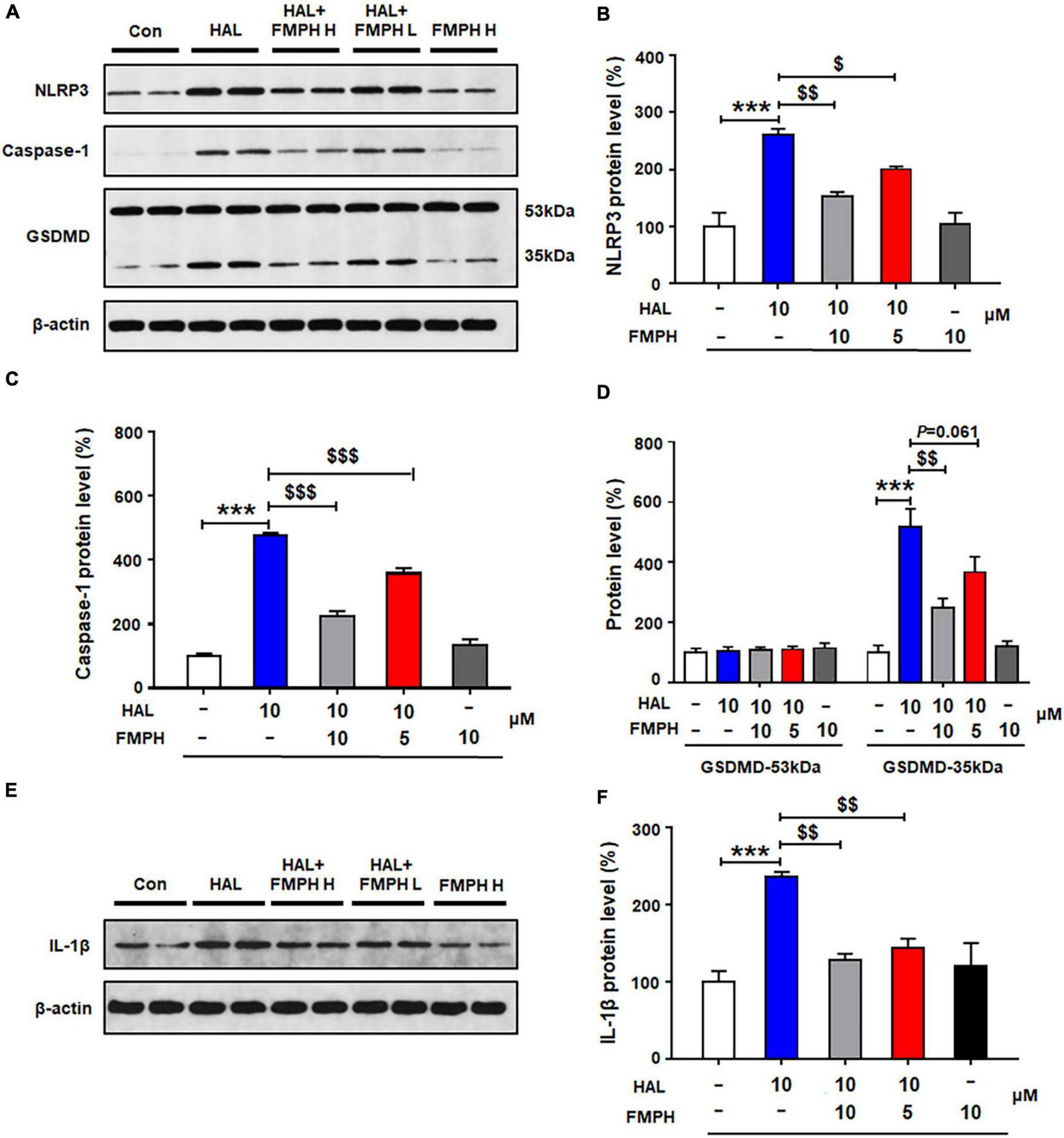 Similarly to the other three antipsychotics, compared with vehicle, 24-h haloperidol treatment significantly upregulated NLRP3 (by 160.1 ± 11.5%, p = 0.000), caspase-1 (by 376.8 ± 8.5%, p = 0.000), GSDMD 35 kDa (by 417.1 ± 60.4%, p = 0.000) and IL-1β (by 135.8 ± 6.8%, p = 0.000) (Figures 9A–F). Co-treatment with either FMPH high or low dose counteracted the haloperidol-induced increased expression of NLRP3 (high dose, by 106.8 ± 7.1%, p = 0.001; low dose, by 59.6 ± 4.7%, p = 0.046), caspase-1 (high dose, by 252.6 ± 16.8%, p = 0.000; low dose, by 118.3 ± 16.4%, p = 0.000), GSDMD 35 kDa (high dose, by 260.0 ± 31.5%, p = 0.001; low dose, by 150.9 ± 52.4%, p = 0.061) and IL-1β (high dose, by 107.7 ± 8.3%, p = 0.001; low dose, by 92.3 ± 12.3%, p = 0.004).