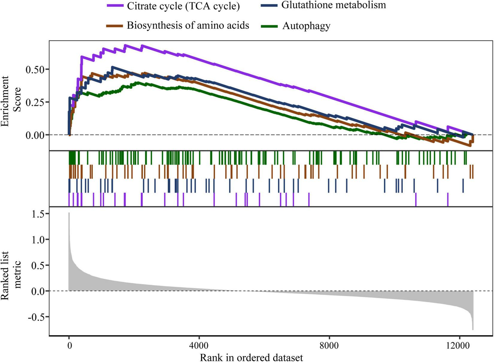 Representative GSEA enrichment pathways of GHK-induced transcriptional responses. The pathways shown in the picture are citrate cycle (TCA cycle) (hsa00020); glutathione metabolism (hsa00480); biosynthesis of amino acids (hsa01230); and autophagy-animal (hsa04140).