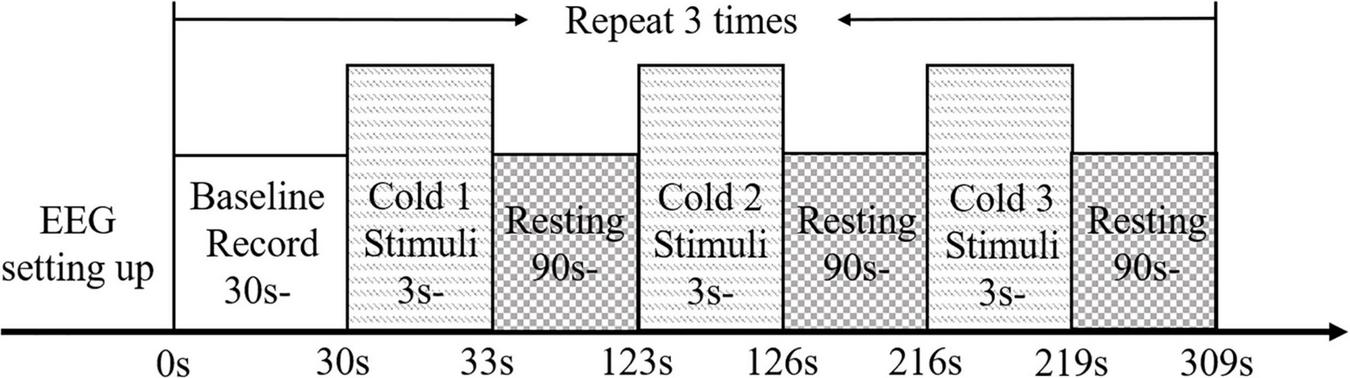 where, the PRelative/band is the relative spectral power (RSP) of a frequency band; p(f) is the power spectral density of an EEG segment for a cold stimulation event, which is estimated by Fast Fourier Transform. F1 and F2 are the cutoff frequencies of a EEG frequency band, as stated above; and pBaseline(f) is the power spectral density of the EEG segments in the baseline tests of each trial. Similar analysis methods were adopted in our previous study (Huang et al., 2020).