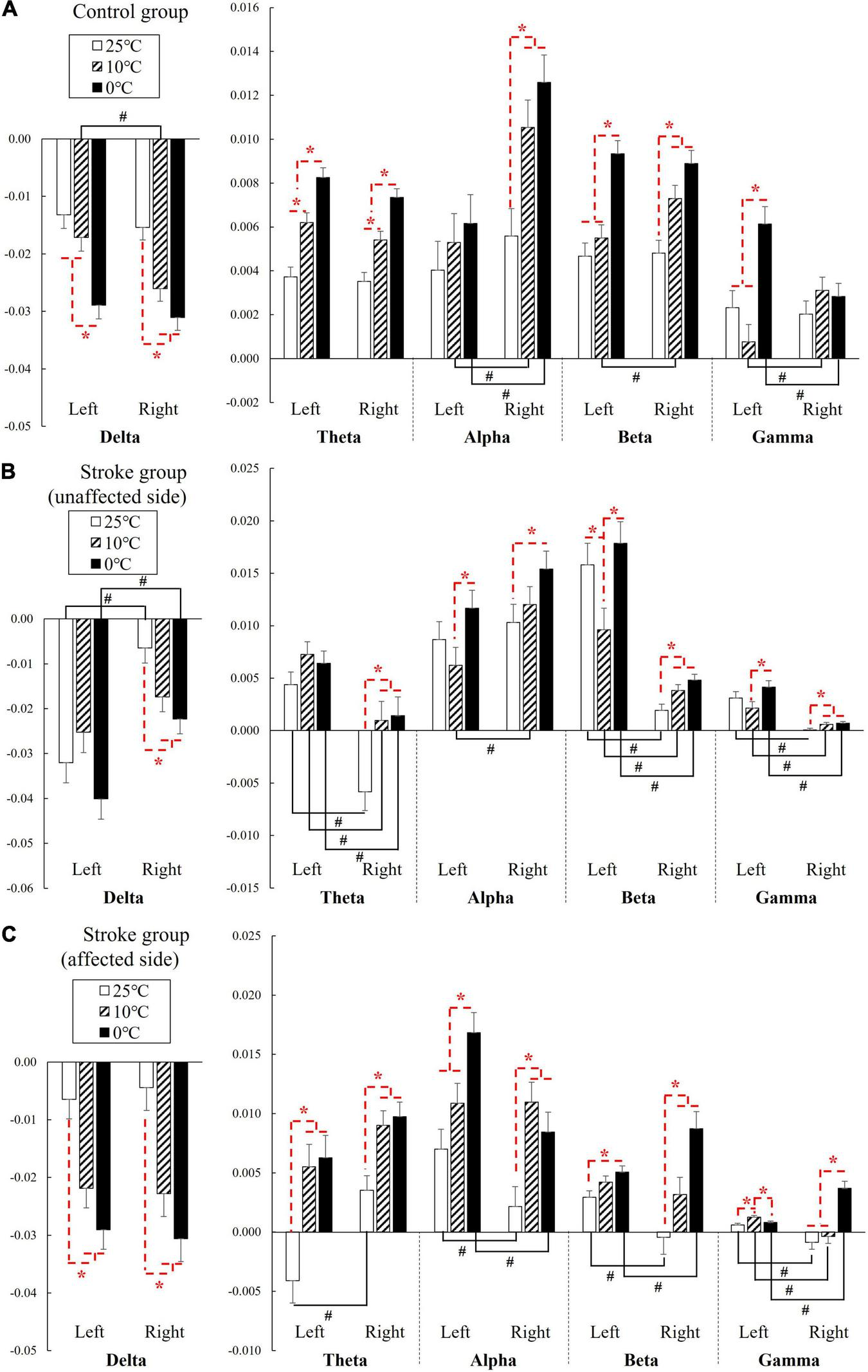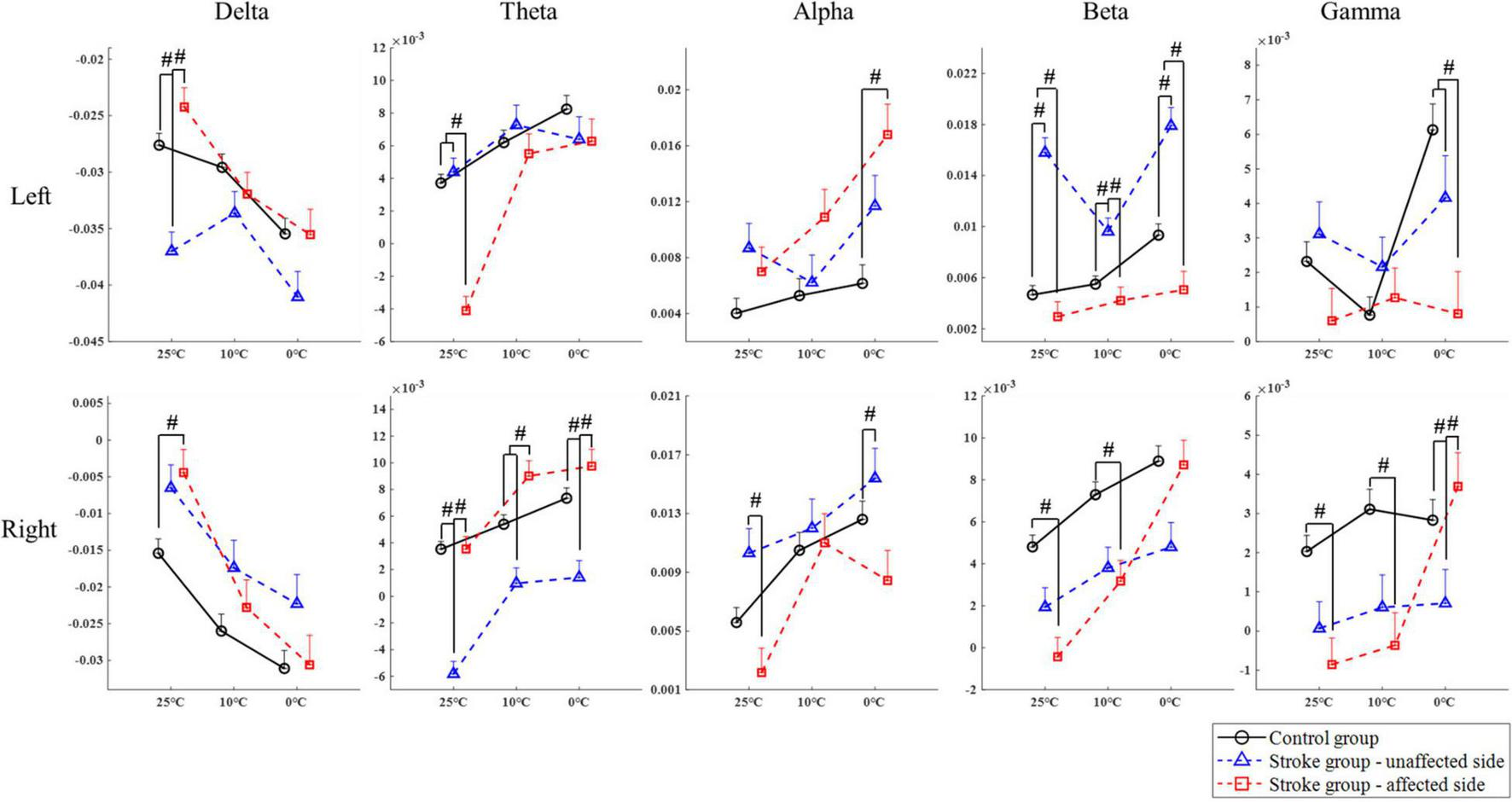 Twelve individuals with chronic stroke and fifteen unimpaired controls were recruited. A 64-channel EEG system was used to investigate the post-stroke cortical responses objectively during the NPCS. A subjective questionnaire of cold sensory intensity was also administered via a numeric visual analog scale (VAS). Three water samples with different temperatures (i.e., 25, 10, and 0°C) were applied to the skin surface of the ventral forearm for 3 s via glass beaker, with a randomized sequence on either the left or right forearm of a participant. EEG relative spectral power (RSP) and topography were used to evaluate the neural responses toward NPCS with respect to the independent factors of stimulation side and temperature.