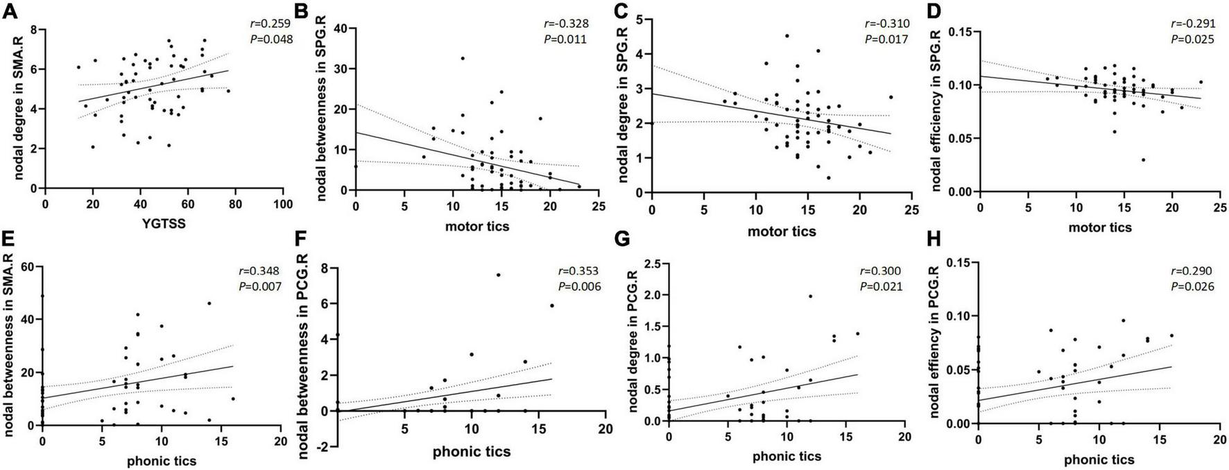 Scatter plots with 95% confidence interval (CI) of nodal brain network properties of different regions compared to YGTSS total scores (A) and sub scores of motor tics (B–D) and phonic tics (E–H).