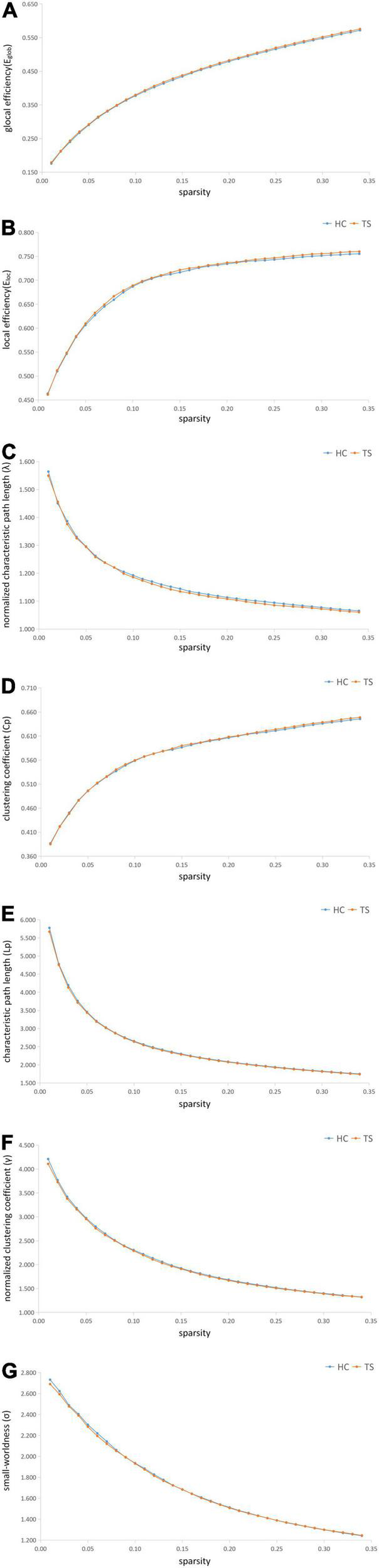 The metrics of the structural connectome of the sparsity threshold in global efficiency (A), local efficiency (B), normalized characteristic path length (λ) (C), clustering coefficient (Cp) (D), characteristic path length (Lp) (E), normalized clustering coefficient (γ) (F), small-worldness (σ) (G), respectively.