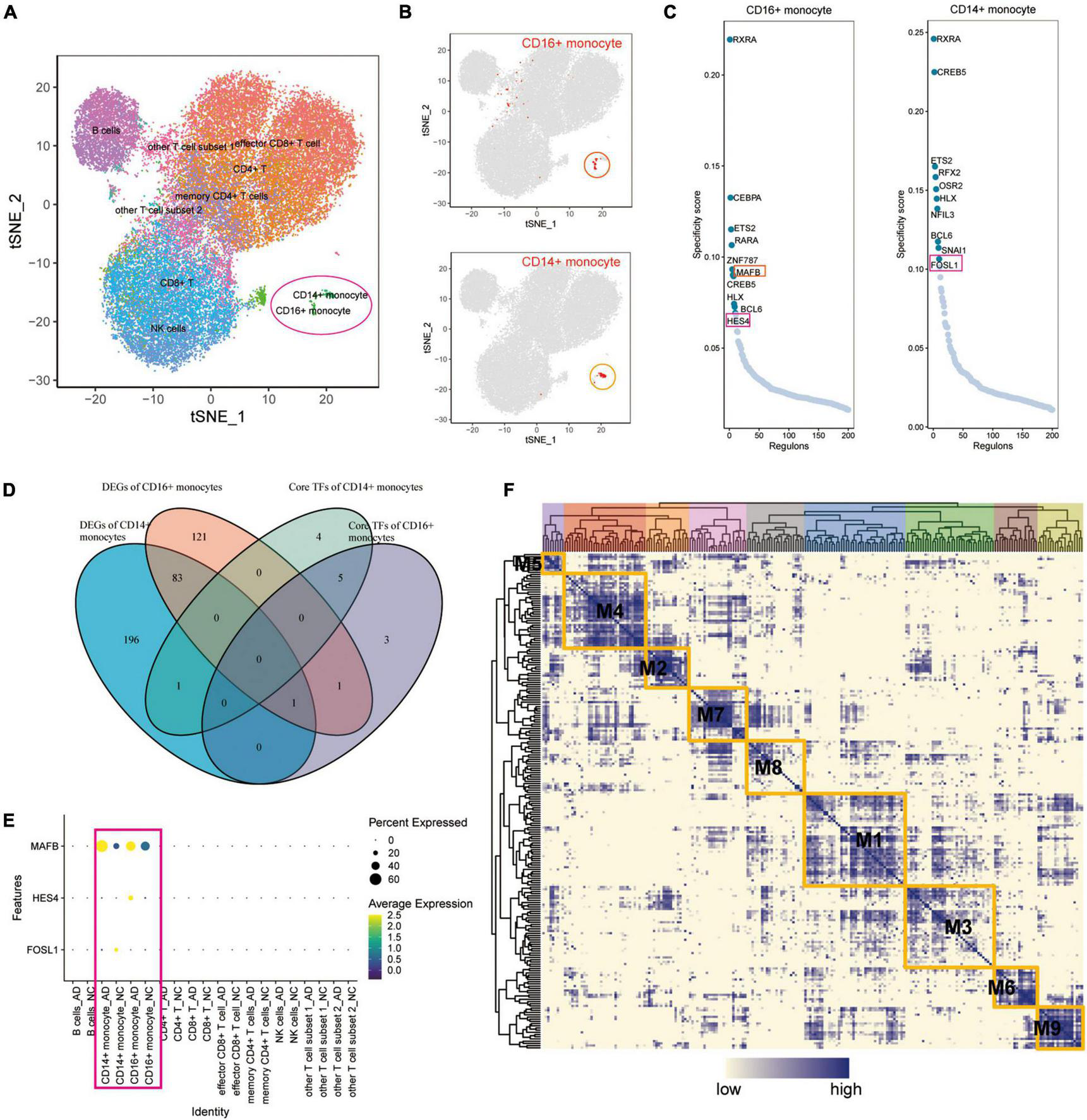 The key transcription factors of monocytes affected by exercise in patients with AD. (A) Unsupervised clustering analysis of the GSE181279 dataset was re-performed using the t-SNE method; (B) The t-SNE plot showing the clustering results of CD14+ and CD16+ monocytes, which suggest that the monocytes are well clustered; (C) The top 10 TFs of CD14+ and CD16+ monocytes based on RSS ranking positions; (D) Venn diagram of intersection analysis of DEGs in CD14+ and CD16+ monocytes from patients with AD and having key TFs in top10 of CD14+ and CD16+ monocytes; (E) Dotted heat map demonstrating the differential expression profile of MAFB, HES4, and FOSL1 genes in the AD and NC groups; (F) Expression of transcription factors quantified using an entropic strategy and re-clustered in the same way.