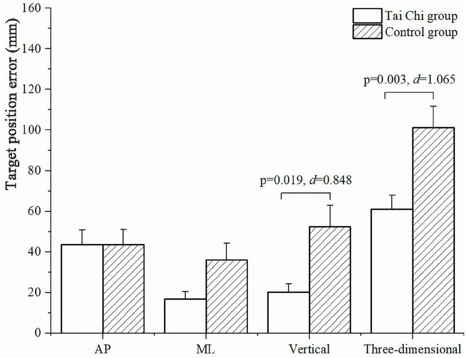 The TPE between Marker-1 and Marker-2 is shown in Figure 2. The bar chart with error lines represented the mean and standard error of the TPE among the Tai Chi and control groups. Compared with the control group, the Tai Chi group had significantly less TPE in the vertical direction (TPEV; Tai Chi group: 20.3 ± 3.9 mm; control group: 34.9 ± 4.4 mm, p = 0.019, d = 0.848) and in three-dimensional space (Tai Chi group: 61.0 ± 6.9 mm; control group: 101.3 ± 10.3 mm, p = 0.003, d = 1.065) during the BTT.