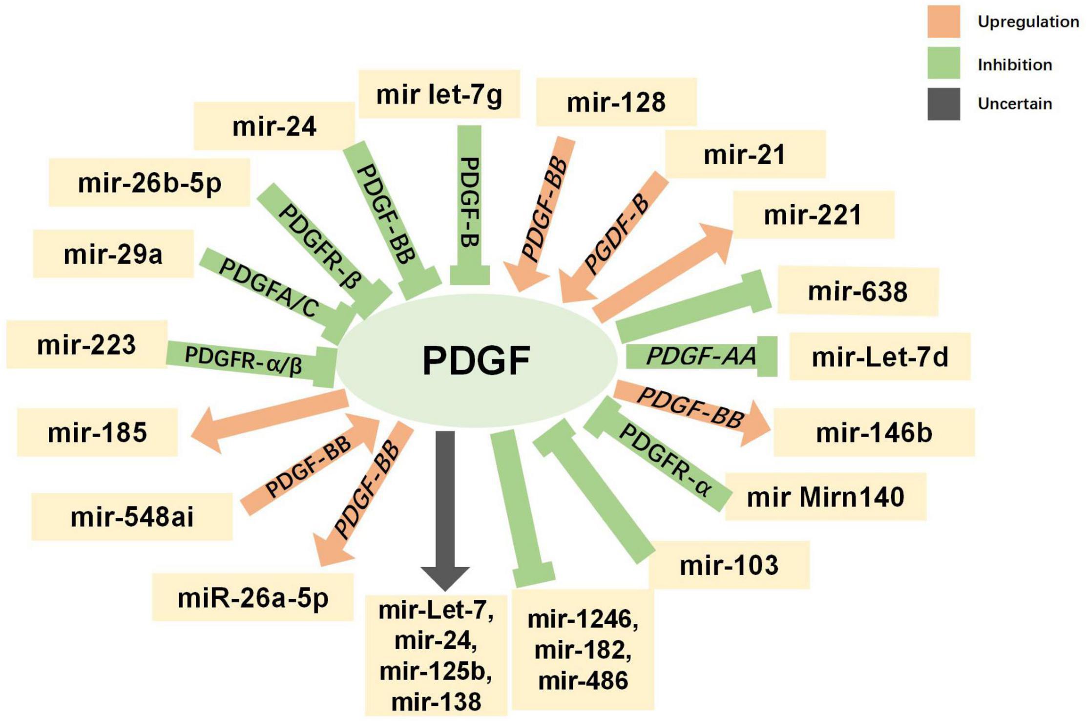 Figure 5. Interaction between platelet-derived growth factors (PDGFs) and microRNAs. Green indicates inhibitory regulation; orange indicates facilitative regulation; and gray indicates unclear regulation.