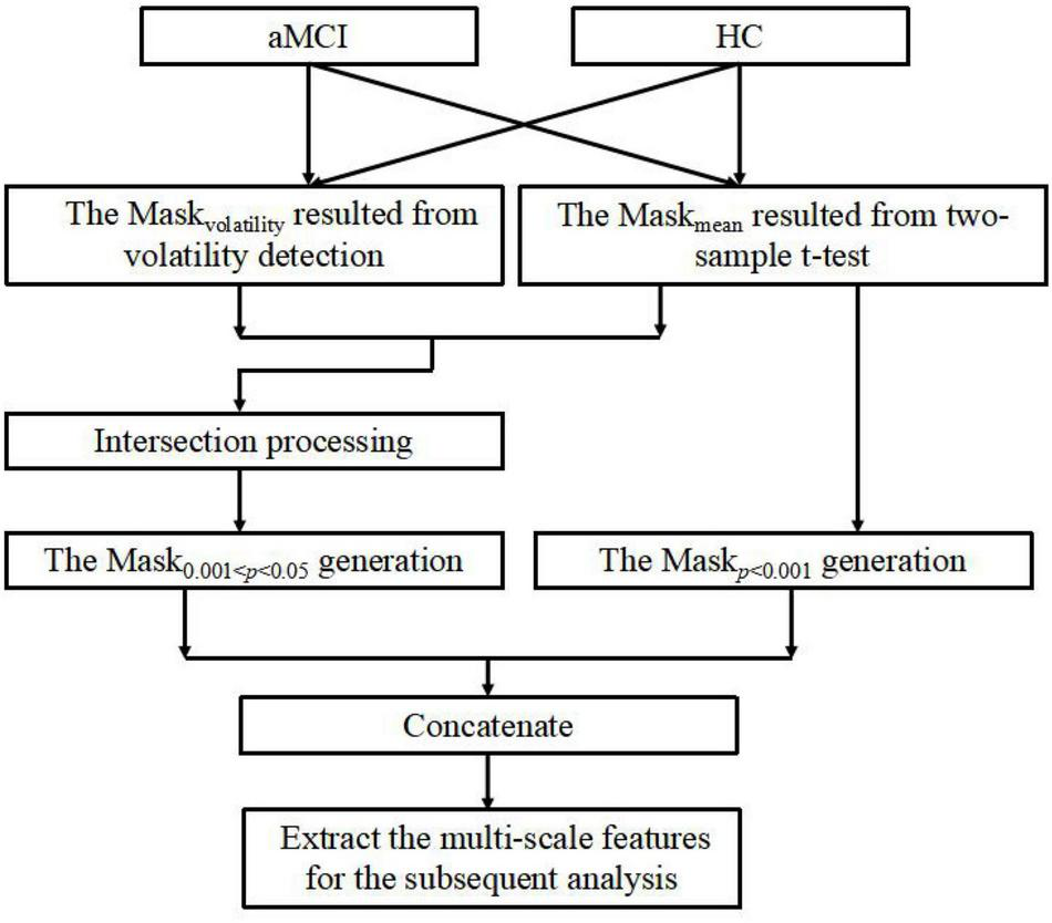 where denotes the average value of the selected pixel or selected brain region, n denotes the number of subjects within the group, and xj denotes the value of the selected pixel or selected brain region corresponding to the ith subject. To obtain the features under multiple significant thresholds, we use Maskvolatility and a two-sample t-test to generate the mask of 0.001 < p < 0.05, defined as Mask0.001 < p < 0.05, which makes a large difference between the averages of the classes and the fluctuations within the classes are stable. Next, we further use the traditional method that extracts the features obtained from p < 0.001 to generate a mask, defined as Maskp < 0.001. And finally, Mask0.001 < p < 0.05 and Maskp < 0.001 are concatenated as the input mask of whole-brain structures or functional networks to extract the final features. It is worth mentioning that the whole-brain structures employed in this study are calculated using the ALFF method and ReHo method, respectively, which are commonly employed to analyze neural activity in the brain and reduce the dimensions of brain data.