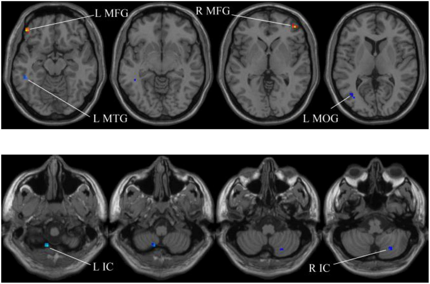 In our experiments, the MGS-WBC model is adopted in two whole-brain structures, including ReHo and ALFF, to reduce the data redundancy and extract multiscale features. For the whole-brain structure calculated by ReHo, as shown in Table 1 and Figures 4, 5, we obtain 10 obvious regions of the brain using MGS-WBC model, including the right gyrus rectus (GR), left pallidum (PAL), left cingulate gyrus (CG), left supplementary motor area (SMA), left inferior cerebellum (IC), right IC, left middle temporal gyrus (MTG), left middle frontal gyrus (MFG), right MFG, and left middle occipital gyrus (MOG), while only six obvious brain regions, namely, left IC, right IC, left MTG, left MFG, right MFG, and left MOG, are found using a single significant threshold (two-sample t-test, p < 0.001). Significantly, each significant region is composed of the activated voxels in the brain. Then, the features extracted from 10 significant regions and six significant regions are separately employed as the input of classifiers, including NB, LDA, LR, and SVM, to evaluate the aMCI’s diagnostic performance. Table 2 presents the diagnostic performance of aMCI using different feature extraction methods of the whole-brain structure (ReHo). The results of MGS-WBC2 all exceed 66.67% in the four classifiers. Besides, compared with the single significant threshold in the whole-brain structures (SSW1) (Zhang et al., 2015; Yang et al., 2018), the results of MGS-WBC3 provide the ACC of 88.06, 89.55, 91.04, and 91.04% in the four classifiers, improving by 4.48, 2.98, 10.44, and 4.47%, respectively. Concurrently, the AUC are 94.12, 96.08, 96.88, and 95.72% in four classifiers, and the increases are 2.24, 1.96, 5.53, and 1.51% compared with SSW1. For F1-Score, we provide about 87.88, 89.55, 91.18, and 90.91% in four classifiers, and maximum improvements are 4.30, 2.23, 9.49, and 3.95% compared with SSW1.