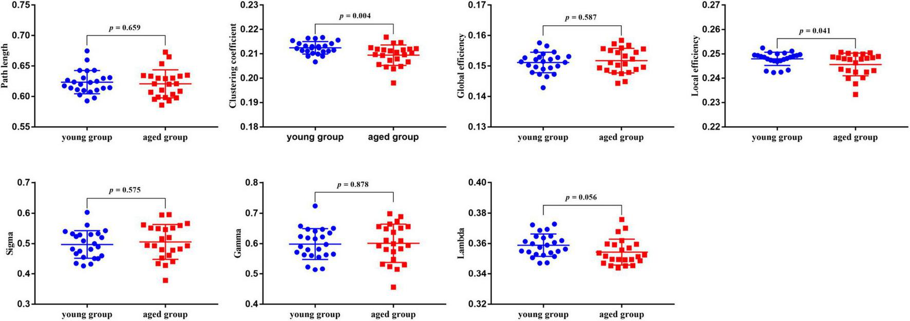 | Global network properties | Young group (n = 24) | Aged group (n = 23) | p-values |