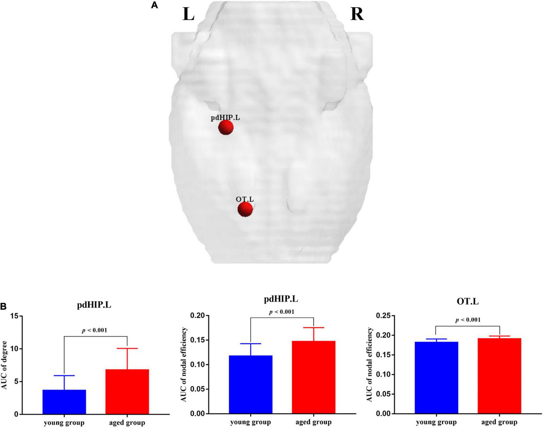 The nodes showed significant changes in regional properties between the young rats and the aged rats. (A) Red spheres indicate nodes with increased nodal properties in the aged rats. (B) The bar plots display the mean (standard error) of degree and nodal efficiency values of pdHIP.L and OT.L for each group. pdHIP.L, left posterior dorsal hippocampus; OT.L, left olfactory tubercle.