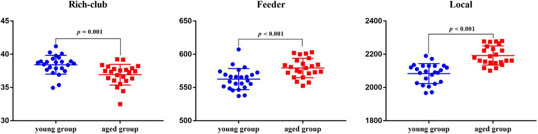 Relative to the young rats, the aged rats exhibited significantly increased overall strength in feeder and local connections (feeder: p < 0.001; local: p < 0.001), whereas rich-club connections strength decreased significantly in the aged rats (p = 0.001) (Figure 5).