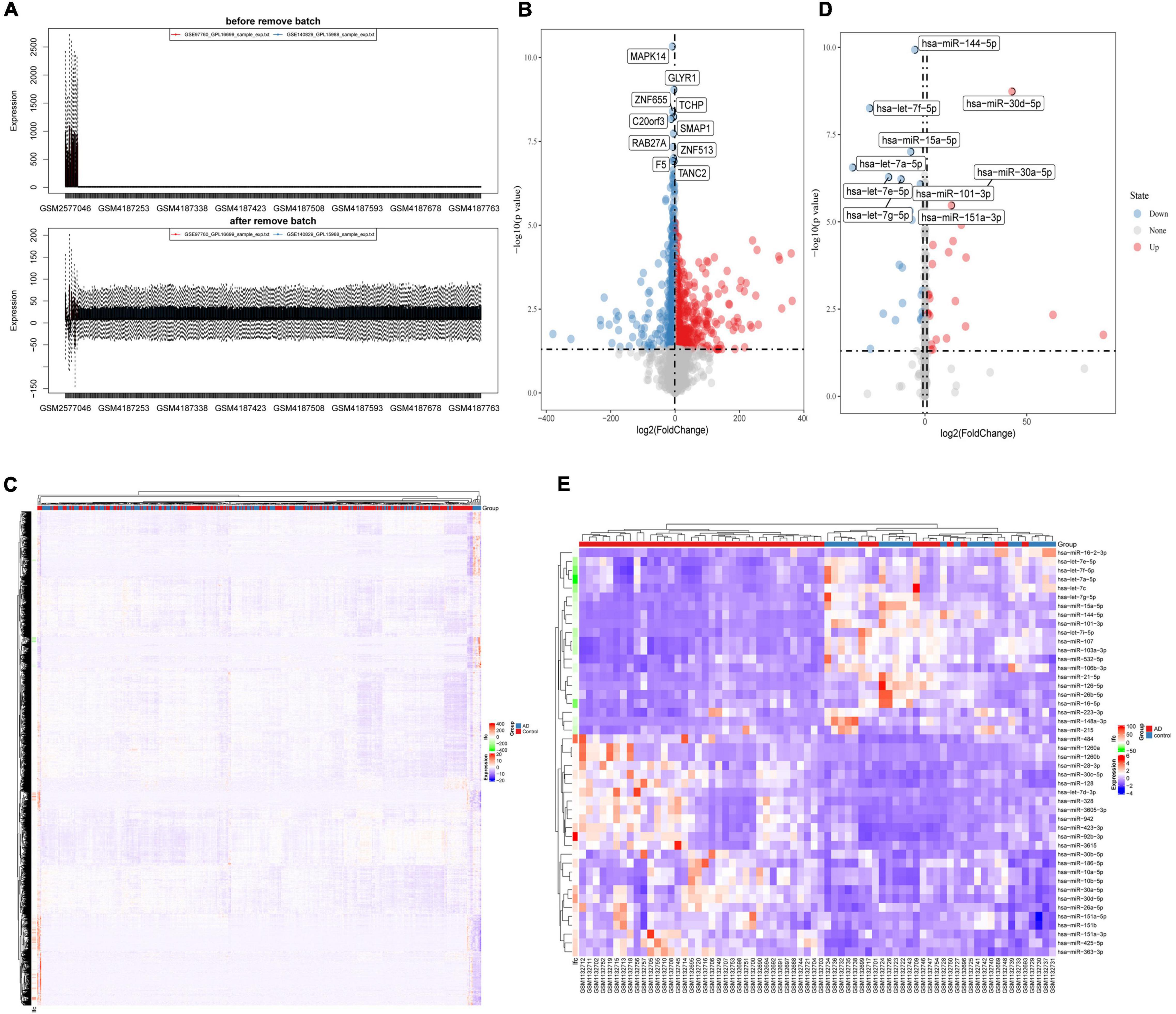 Figure 1. (A) The SVA package removes the batch effect between GSE140829 and GSE97760. (B) Volcano plot and (C) heatmap for the differentially expressed mRNAs in the merged dataset (GSE140829 and GSE97760). (D) Volcano plot and (E) heatmap for the differentially expressed miRNAs in GSE46579. Red dots represent up regulation, blue dots represent down regulation, and gray dots represent non-differentially expressed RNA.