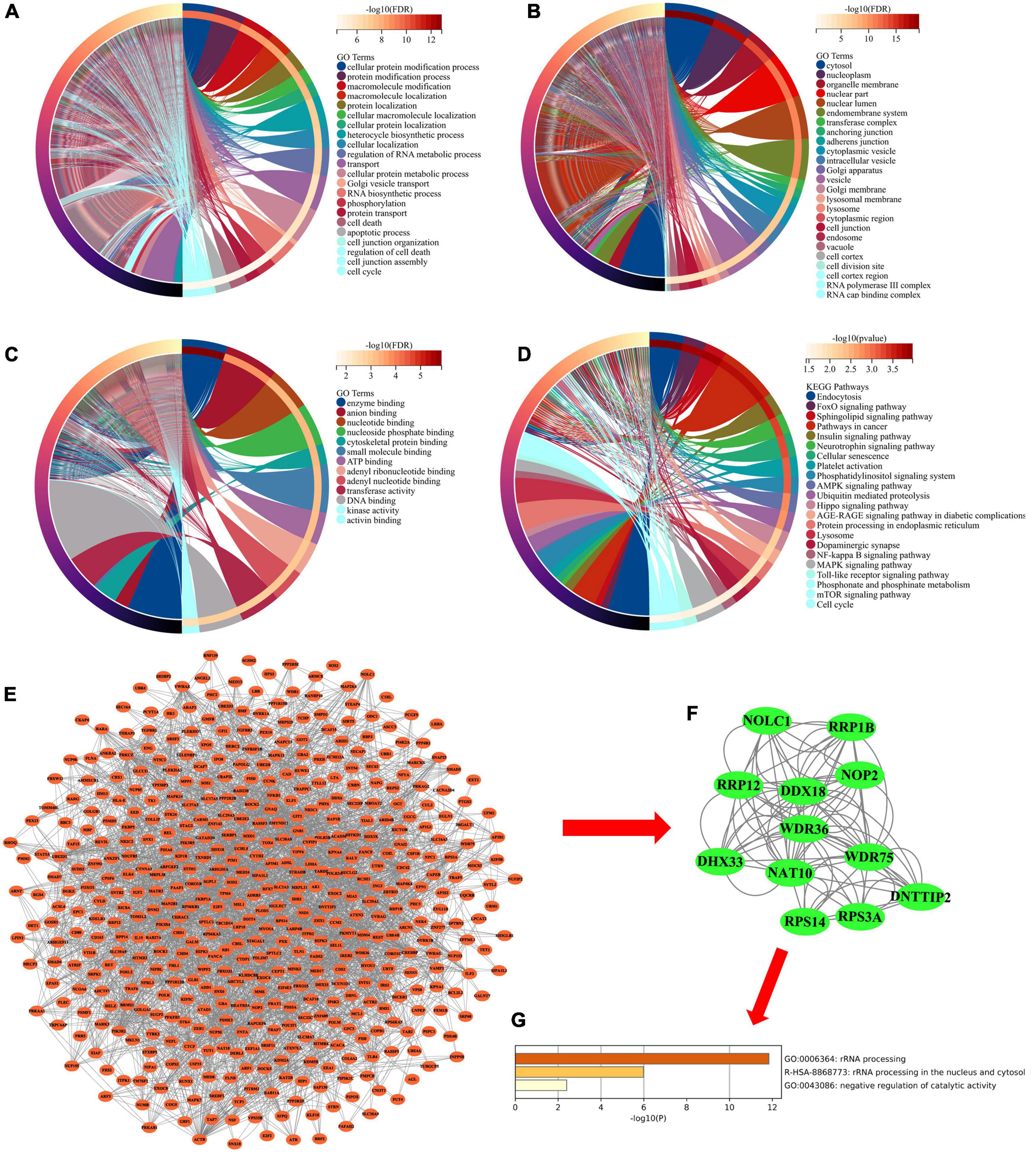 Figure 4. (A) Chord diagram showing enriched GO-BP clusters for the mRNAs in miRNA-mRNA regulatory network. BP, biological processes. (B) Chord diagram showing enriched GO-CC clusters for the mRNAs in miRNA-mRNA regulatory network. CC, cell composition. (C) Chord diagram showing enriched GO-MF clusters for the mRNAs in miRNA-mRNA regulatory network. MF, molecular functions. (D) Chord diagram showing enriched KEGG clusters for the mRNAs in miRNA-mRNA regulatory network. GO, Gene Ontology; KEGG, Kyoto Encyclopedia of Genes and Genomes. (E) PPI network analysis for the mRNAs in miRNA-mRNA regulatory network. PPI, protein–protein interaction. (F) The hub subnetwork from PPI network by Molecular Complex Detection (MCODE) plug-in. (G) Functional enrichment analysis of mRNAs in hub subnetwork.