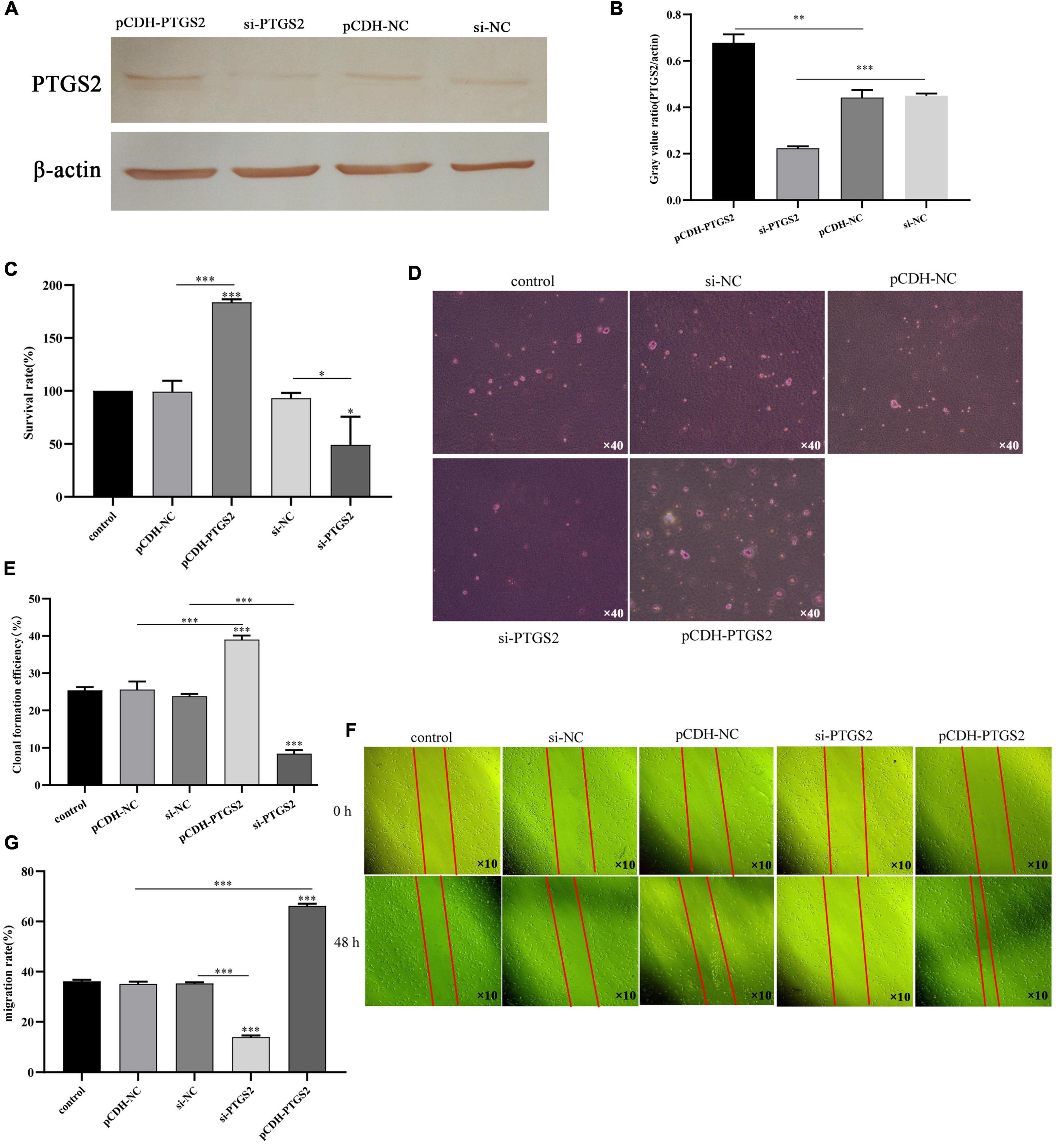 Figure 7. (A,B) The transfection efficiency of pCDH-PTGS2 and si-PTGS2 was detected by western blot. (C) The effects of PTGS2 knockdown or overexpression on the vitality of AD model cells (Aβ25–35-treated SH-SY5Y cells) measured using the CCK-8 assay. (D,E) The effects of PTGS2 knockdown or overexpression on the proliferation of AD model cells (Aβ25–35-treated SH-SY5Y cells) measured using the soft agar assay. Scales: 10 × 40. (F,G) The effects of PTGS2 knockdown or overexpression on the migration of AD model cells (Aβ25–35-treated SH-SY5Y cells) measured using the wound healing assay. Scales: 10 × 10. The data are shown as the mean ± standard deviation. The horizontal line indicates the comparison between groups at both ends, and the non-horizontal line indicates the comparison with the control group. AD: Alzheimer’s disease. ***p < 0.001; **p < 0.01; *p < 0.01.