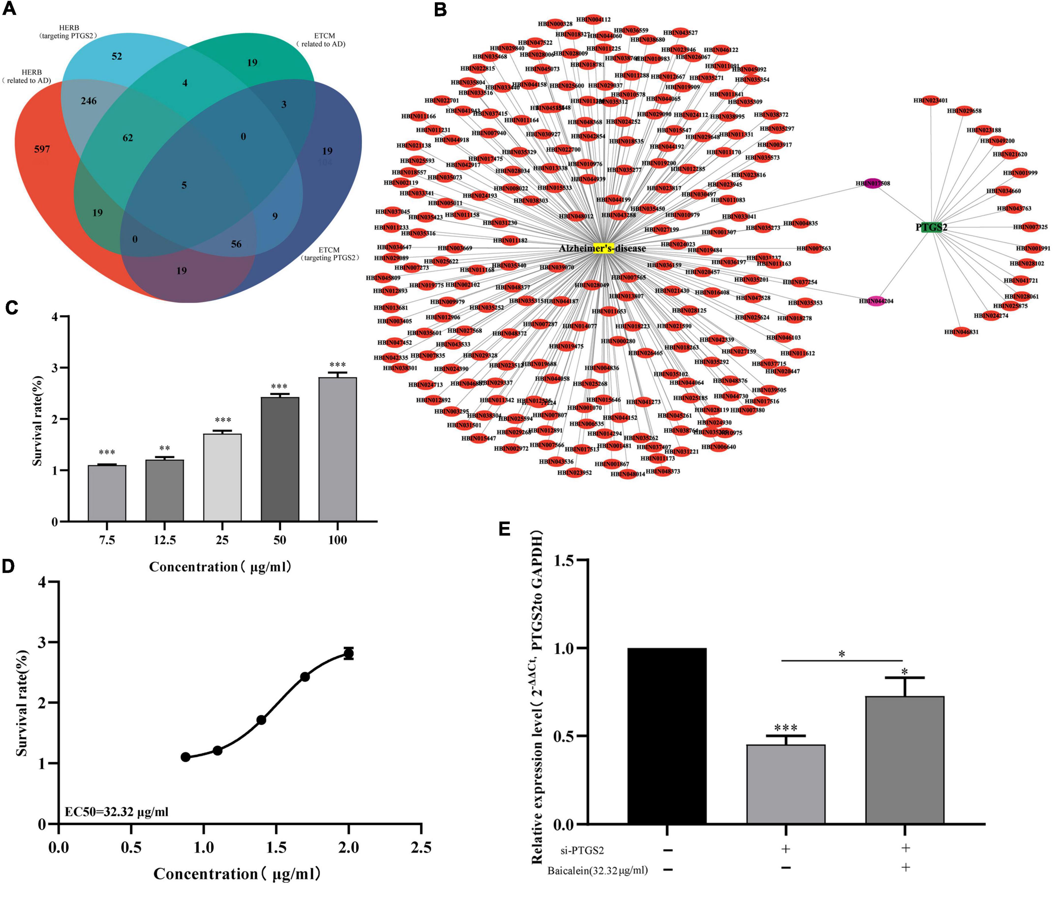 Figure 9. (A) Venn diagram shows the overlap between AD related Chinese herbs and PTGS related Chinese herbs. (B) Network of AD related components in HUANGQIN and PTGS2 targeted components in HUANGQIN. (C) The effects of different concentrations baicalein on the vitality of AD model cells (Aβ25–35-treated SH-SY5Y cells) measured using the CCK-8 assay. (D) EC50 fitting curve of baicalein in AD model cells (Aβ25–35-treated SH-SY5Y cells). (E) The effect of baicalein on the expression of PTGS2 by qPCR in AD model cells (Aβ25–35-treated SH-SY5Y cells). AD, Alzheimer’s disease. The expression level of GAPDH was used as an internal reference for PTGS2. The data are shown as the mean ± standard deviation. The horizontal line indicates the comparison between groups at both ends, and the non-horizontal line indicates the comparison with the control group. ***p < 0.001; *p < 0.05.