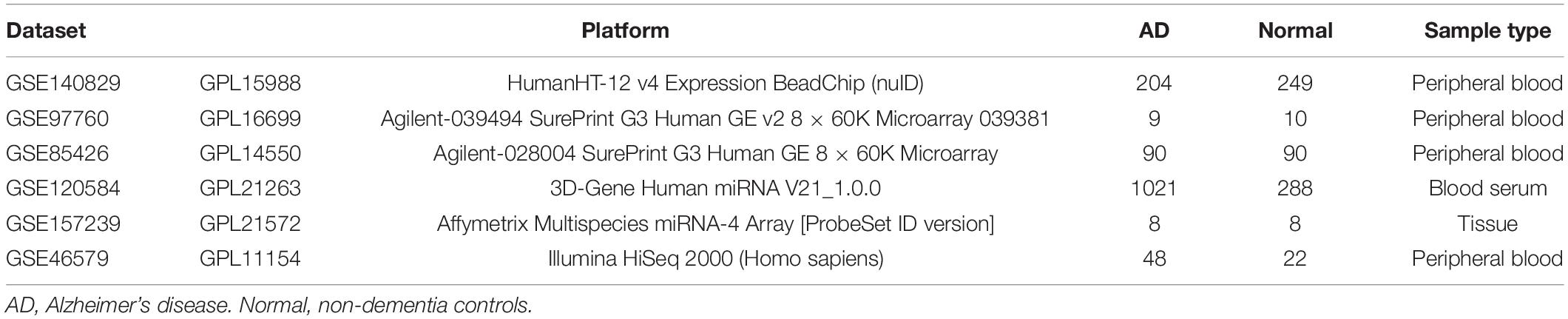 The mRNA (GSE140829, GSE97760, GSE85426) and miRNA (GSE120584, GSE157239, GSE46579) expression profiles of AD are downloaded from Gene expression Omnibus (GEO1). The detailed information of all downloaded data sets is summarized in Table 1.