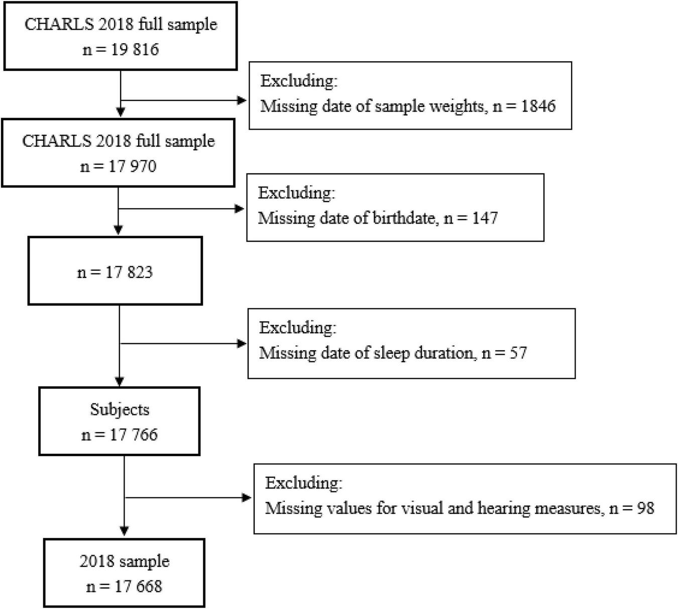 This study used data from the China Health and Retirement Longitudinal Study (CHARLS), an ongoing longitudinal study of Chinese adults aged 45 years or older and their spouses. Initiated in 2011, the CHARLS conducted follow-ups every 2 or 3 years in 2013, 2015, and 2018, to collect an excellent nationally representative sample of the middle-aged and elderly in China. The survey recruited respondents in 150 counties or districts and 450 villages or urban communities throughout the country using multistage stratified probability proportional to size sampling method. In the present study, we used the latest CHARLS wave in 2018 with 19,816 individuals to investigate the associations between sleep duration and sensory impairments. Figure 1 shows the schematic flow of the study sample. Our final sample included 17,668 individuals with or without sensory impairments.