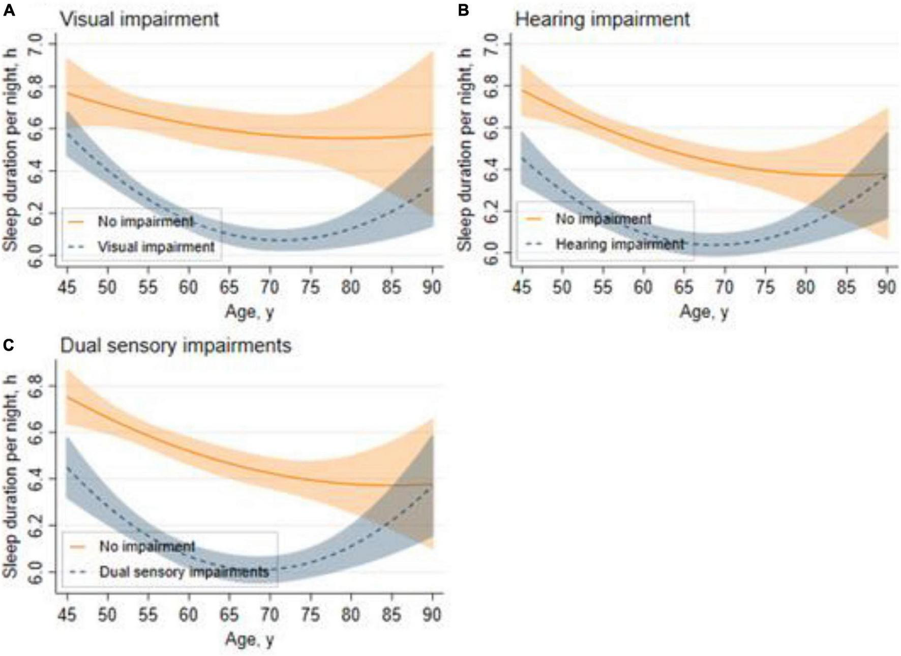 Trajectories for sleep duration across different sensory impairment groups. Graphs display analog values (lines) of sleep duration with 95% CIs (shaded areas) for visual impairment (A), hearing impairment (B), and dual sensory impairments (C).