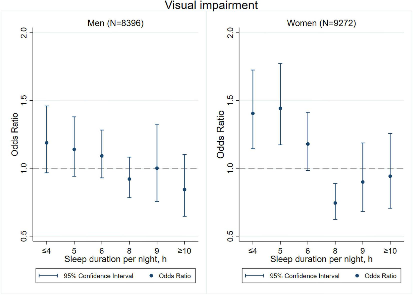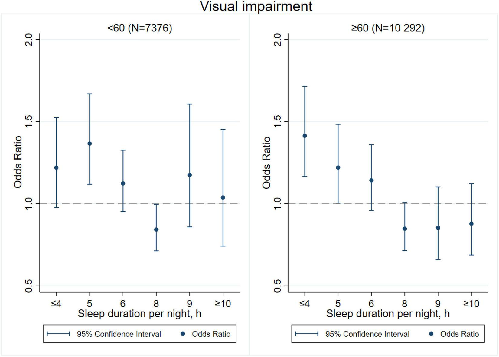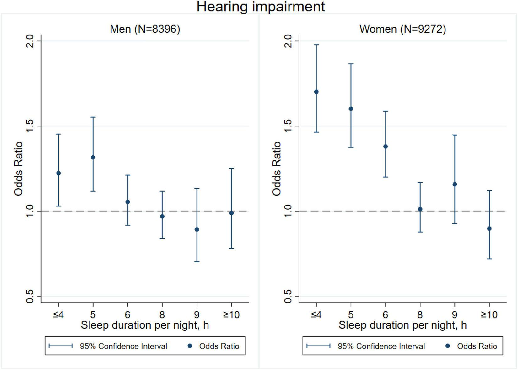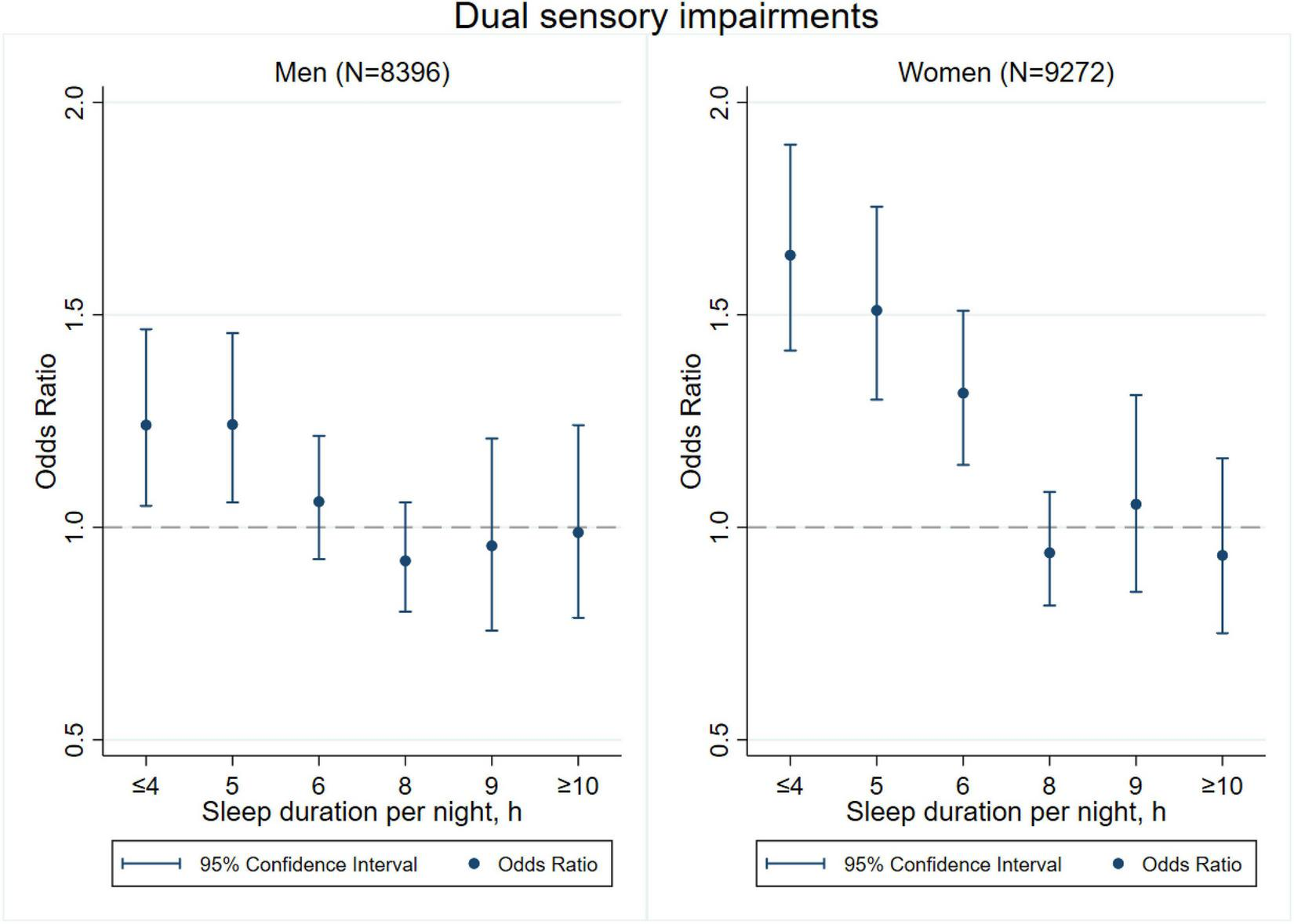 Sleep duration is an important health-related factor in the development of physiological functions. It has been proven to be related with cognitive decline, depression, and other chronic problems (Ma et al., 2020; Matsui et al., 2020; Titova et al., 2021). However, findings on the associations between sleep duration and the risk of sensory impairments are still inconsistent. Evidence from the 2009 National Health Interview Survey (NHIS) in the United States showed that either scarce or excessive sleep was associated with visual impairment (Ramos et al., 2014). Of note, a cross-sectional study of 3,840 respondents aged 50 years or above in South Africa found that only a short sleep duration of less than 6 h was associated with self-reported visual impairment (Peltzer and Phaswana-Mafuya, 2017). Similarly, a study that used data from the baseline survey of the China Health and Retirement Longitudinal Study (CHARLS) suggested that short sleep duration was associated with a higher risk of visual impairment (Sun et al., 2021). As for hearing impairment, little is known about its associations with sleep duration. A study of 632 adults aged 70 years or above in the United States reported that longer sleep duration exceeding 8 h was linked with poorer high-frequency hearing (Jiang et al., 2021). Another study of 48,091 adults aged 20–79 years in Japan suggested that individuals with sleep duration exceeding 8 h had a higher risk of hearing loss (Nakajima et al., 2014). However, most previous studies only put insight into either visual or hearing impairment, instead of analyzing the two most crucial sensory functions under the same framework (Clark-Gambelunghe and Clark, 2015). Therefore, research on the associations between sleep duration and visual and/or hearing impairments is still lacking.