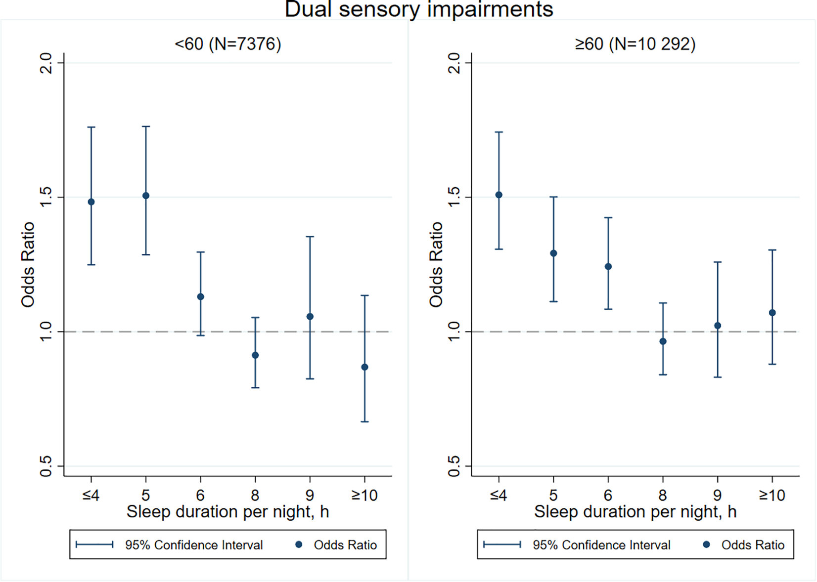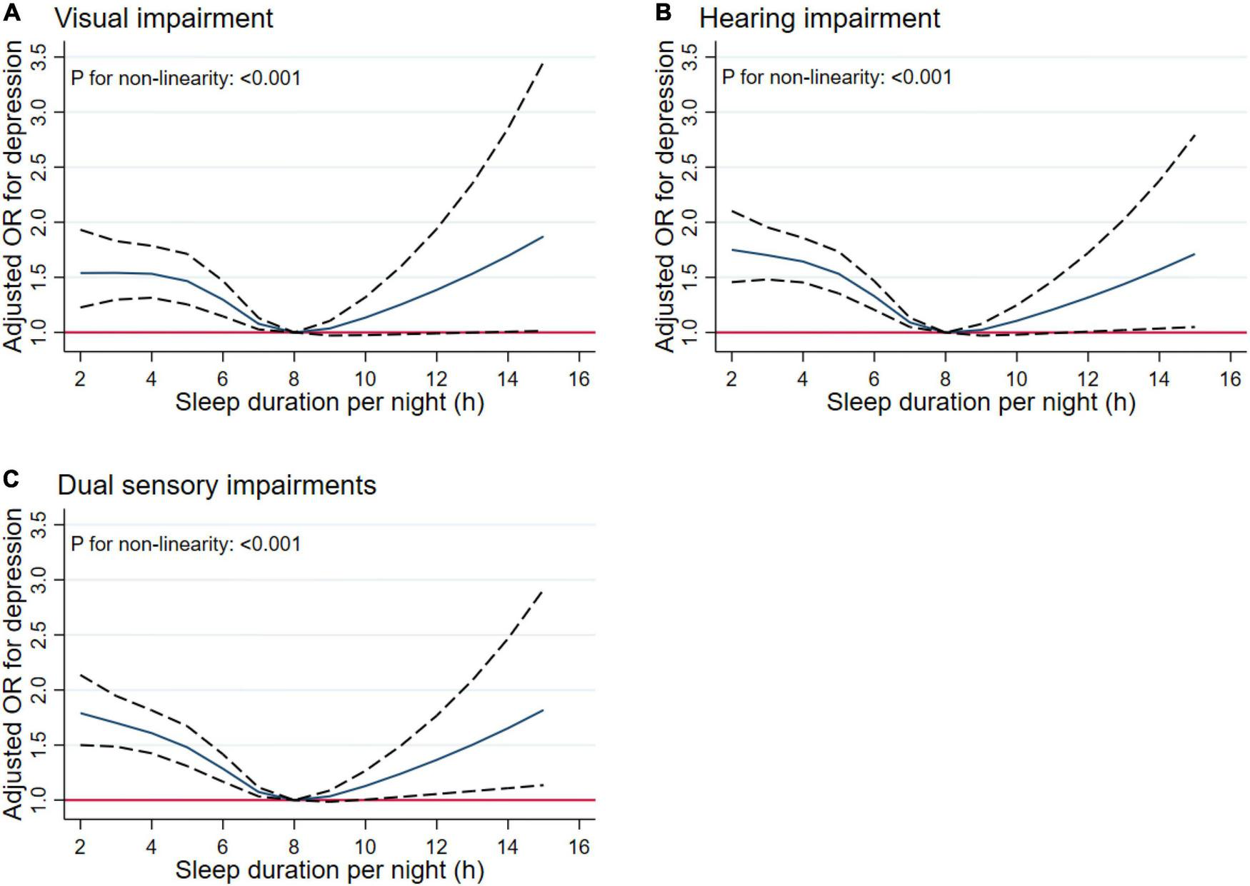 Of the 17,668 respondents, 8,396 (47.5%) were men. The mean (SD) age was 62.5 (10.0) years old. Respondents with short (≤ 4, 5 h per night) sleep duration had a significantly higher risk of visual, hearing and dual sensory impairments than those who slept for 7 h per night after adjusting for covariates (P < 0.05). Meanwhile, respondents who slept for 6 h per night had a higher risk of hearing impairment (P = 0.005). Further analysis suggested a U-shaped association between sleep duration and sensory impairments. When sleep duration fell below 8 h, increased sleep duration was associated with a significantly lower risk of visual (OR, 0.93; 95%CI, 0.88–0.98; P = 0.006), hearing (OR, 0.89; 95% CI, 0.86–0.93; P < 0.001), and dual (OR, 0.90; 95% CI, 0.87–0.94; P < 0.001) impairments. When sleep duration exceeded 8 h, the risk of visual (OR, 1.09; 95% CI, 1.00–1.19; P = 0.048), hearing (OR, 1.04; 95% CI, 0.97–1.11; P = 0.269), and dual (OR, 1.07; 95% CI, 1.00–1.14; P = 0.044) impairments would increase facing prolonged sleep duration. Women and the elderly aged over 60 years old were more sensitive to short sleep duration and experienced a higher risk of sensory impairments.