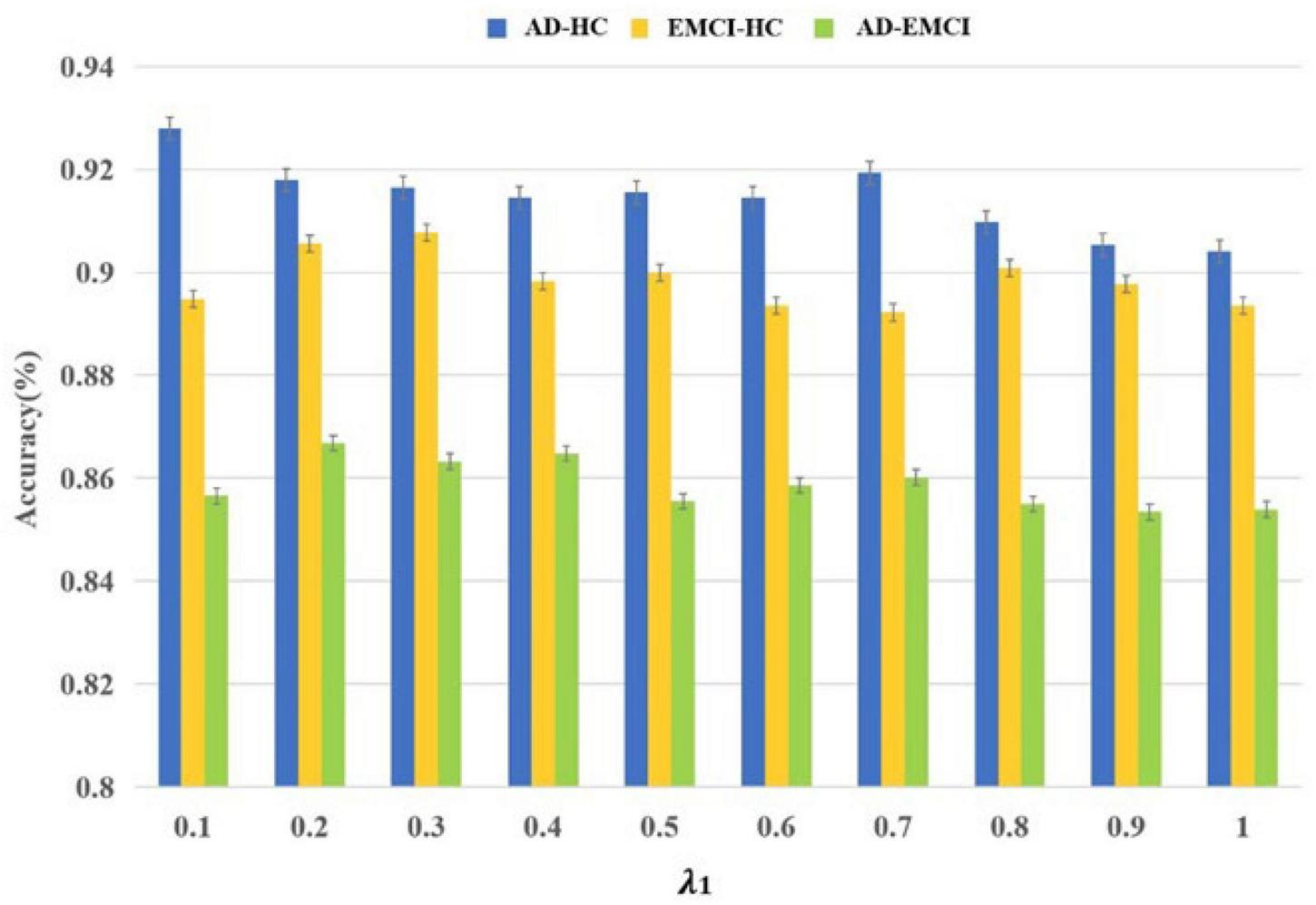 Initially, 187×90=16,830 features were obtained and Strain and Svalid were applied to filter the optimal parameters. The λ was the interval of (0.1, 1), and the corresponding accuracy was calculated in each group. As shown in Figure 2, the best accuracy of the AD-HC group is 92.79% and λ is 0.1. The peak value of the EMCI-HC group is at the node of 0.3. The prediction accuracy reaches a peak with a λ value of 0.2. We can also observe that the accuracy of the AD-HC group is much higher than the other two groups. This may be caused by the large difference between AD and HC. An interesting finding is that the accuracy of the AD-EMCI group is the lowest and the gap in this group is also the lowest. This proves that the similarity between AD and EMCI is higher, and the similar features make the classification more stable.