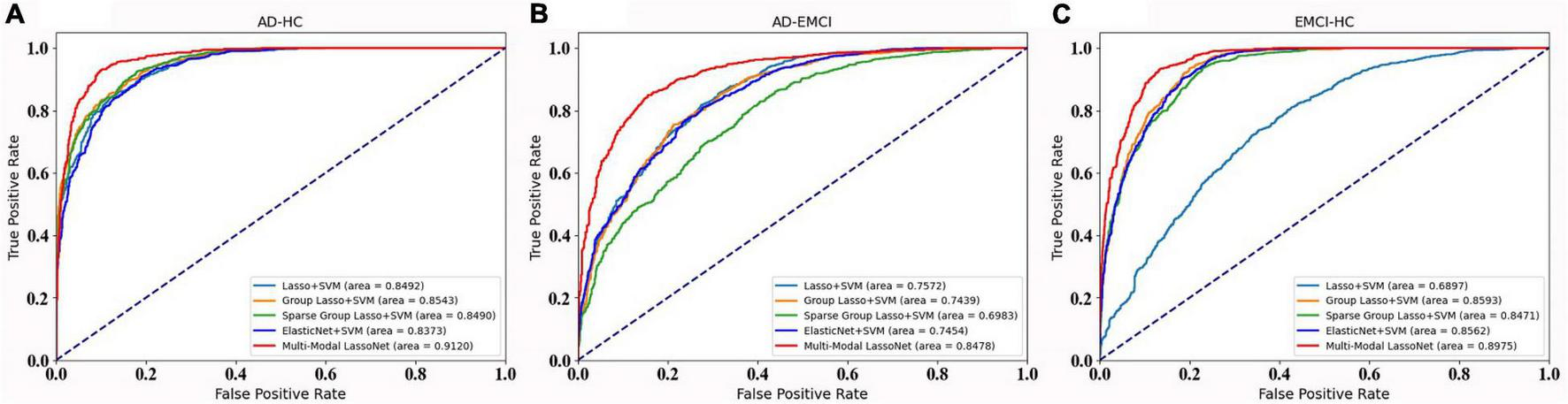 For further validation of our framework and results, we plot the ROC curves of five methods for the AD-HC, AD-EMCI, and EMCI-HC groups, as shown Figure 4. The AUC values of our proposed Multi-modal LassNet for AD-HC, AD-EMCI, and EMCI-HC groups were 0.9120, 0.8478, and 0.8975, respectively.