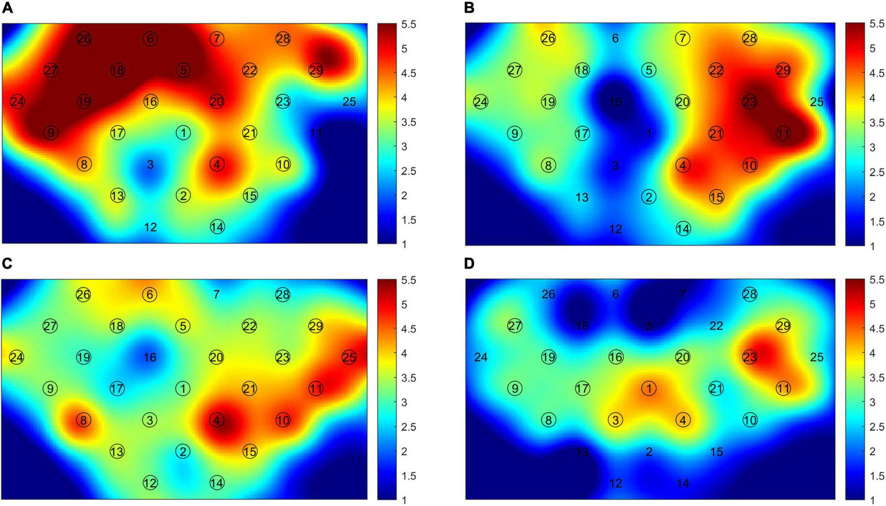 The cerebral cortex activation map. (A) Right-hand task of healthy subjects (HS); (B) left-hand task of HS; (C) right-hand task of left hemisphere stroke (LHS) patients; (D) left-hand task of right hemisphere stroke (RHS) patients. The circled channels are significantly activated channels.