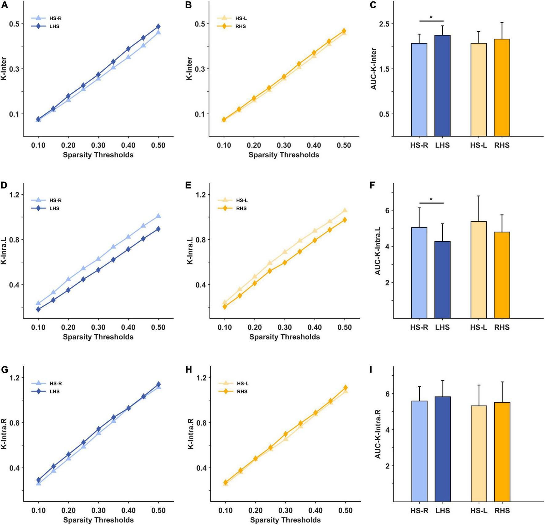 The mesoscale brain network indicators under 10–50% sparsity and their area under curves (AUCs) for patients and healthy subjects (HS). (A) The inter-density under 10%–50% sparsity for HS group (right hand task) and LHS group; (B) the inter-density under 10%–50% sparsity for HS group (left hand task) and RHS group; (C) the AUCs over the whole sparsity range for the inter-density in the HS, LHS and RHS groups. (D–F) are for the indicator intra-density of left hemisphere; (G–I) are for the indicator intra-density of right hemisphere. *p < 0.05.