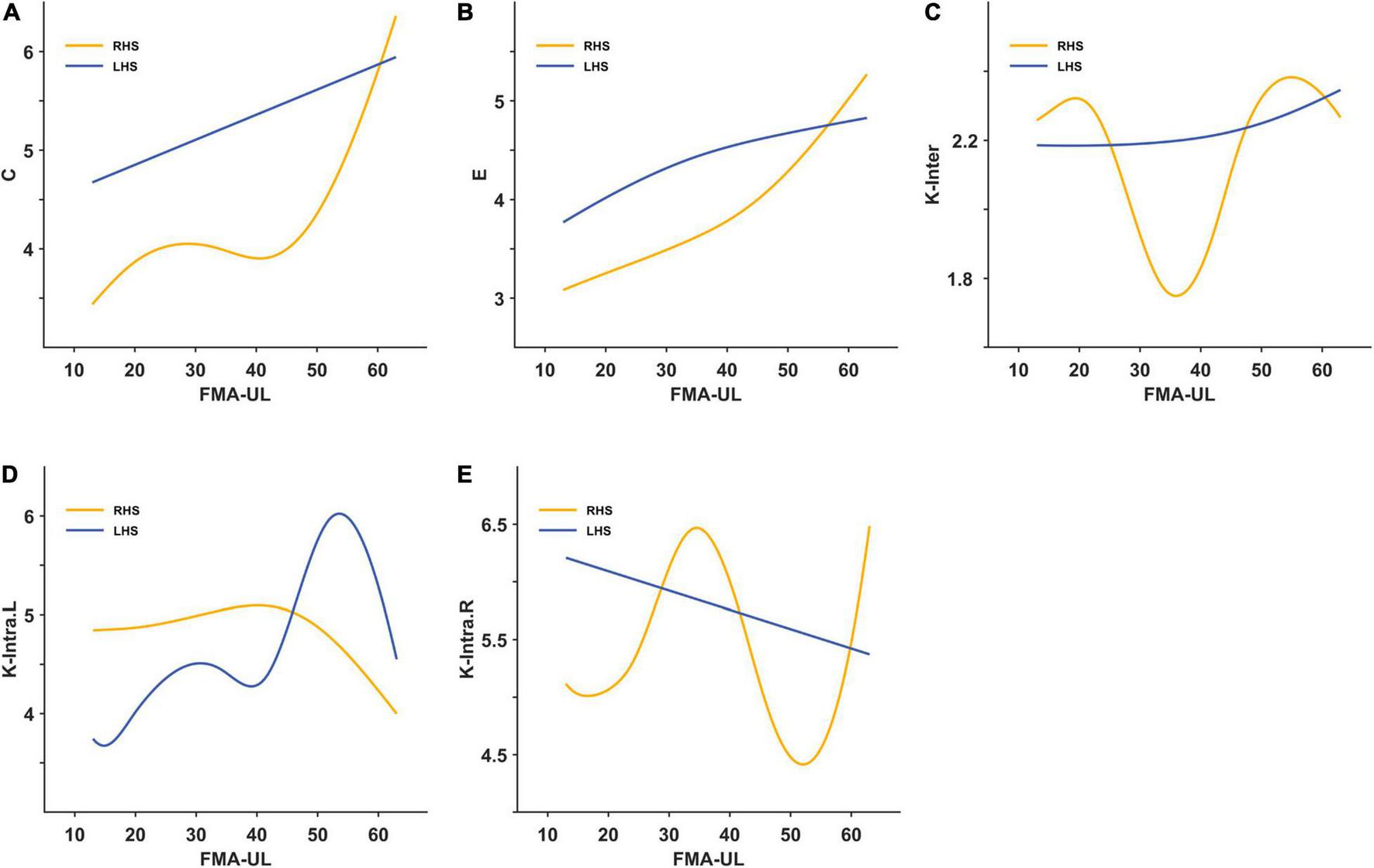 Correlation analysis was made between AUCs of the network indicators and FMA-UL or FMA-hand (Table 2). At large scales, the higher C and E values reflected greater motor function of the upper limb in both groups. But only indicator E in the LHS group was significantly correlated with FMA-UL (r = 0.524, p = 0.031). At the mesoscale, inter-density and FMA-UL were positively correlated in the LHS group (r = 0.304, p = 0.235) and slightly correlated in the RHS group (r = −0.027, p = 0.918). In the LHS group, there was a negative correlation between the K-inter.R and FMA-UL (r = −0.262, p = 0.311). The correlation between other intra-density and FMA-UL was small. Correlation results between brain network indicators and FMA-hand were similar. Among them, the intra-density of the contralesional hemisphere was negatively correlated with the FMA-hand in the RHS group (r = −0.345, p = 0.175). It can be seen from the above results that the correlation between each network indicator and FMA in the LHS group was higher than that in the RHS group. Was that because there was a non-linear correlation?