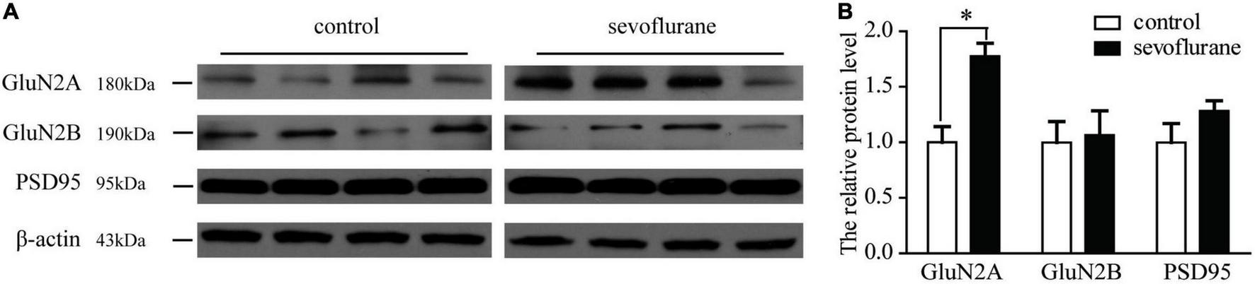 During the process of brain development and maturation, there is a conversion of NMDA receptors from GluN2B to GluN2A. The higher the ratio of GluN2A/GluN2B, the higher the maturity of neurons. To explore whether sevoflurane interfere with this conversion process, the hippocampus from 2-month-old mice was harvested and subjected to Western blot analysis to compare the changes in protein content. Immunoblotting of GluN2A, GluN2B, or PSD95 showed that there was an increase of the levels of GluN2A subunit of NMDA receptor in the hippocampus of the mice after the sevoflurane exposure comparing with the control mice (152 vs. 100%, P = 0.01). There was no significant difference in the levels of GluN2B or PSD95 between the sevoflurane-treated mice and the control mice (Figure 4). This indicates that sevoflurane either promotes the above-mentioned conversion process or promotes the expression of GluN2A.