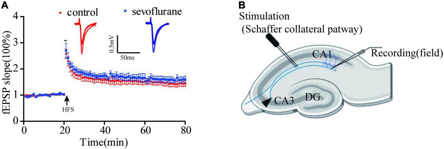 Sevoflurane did not significantly change long-term potentiation (LTP). (A) We tested 0, 20, 40, and 60 min after high-frequency stimulation, and the response of sevoflurane exposure group to HFS has a mild increase than that of control group, but it was not statistically significant. (B) The position of stimulating and recording electrode in CA1 region. Data are presented as mean ± SEM (n = 6 slices from 5 mice for control group and n = 5 slices from 5 mice for sevoflurane group).