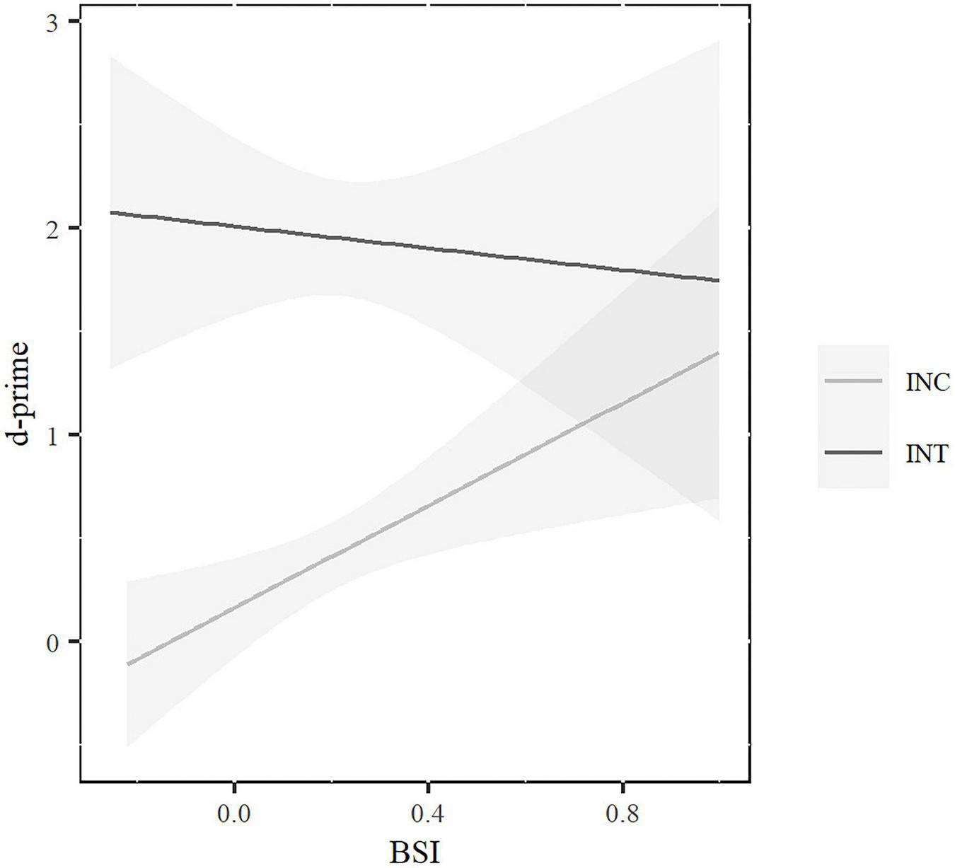 Figure 2. Rule-learning d’ scores associated to BSI for incidental (INC) and intentional (INT) conditions. Highlighted areas represent standard error.