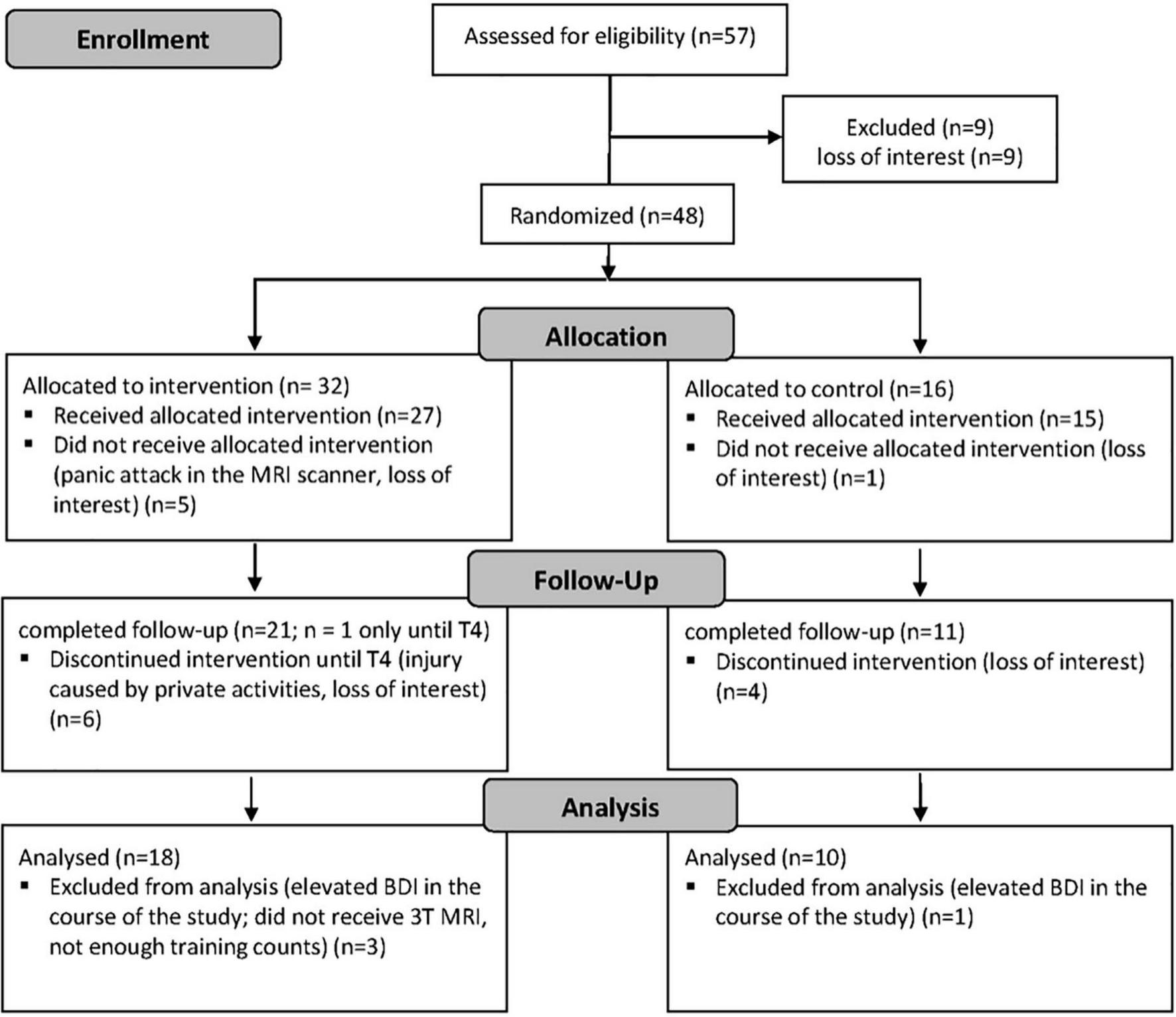 In total, 57 subjects with a sedentary lifestyle were assessed for eligibility after giving informed consent (Figure 2). Of these, nine were excluded due to loss of interest. Of the remaining 48 subjects, 32 were randomized to the intervention group (IG) and 16 to the control group (CG), respectively (randomization 2:1 IG and CG). Five of the subjects allocated to the IG did not receive the intervention due to panic attacks in the MRI or loss of interest, and another six subjects discontinued the intervention due to injury and loss of interest, leaving a total of 21 subjects in the IG who completed the follow-up. Of the 16 subjects allocated to the CG, one subject did not receive the intervention due to loss of interest, and four dropped out during the intervention due to loss of interest, leaving a total of 11 control subjects who completed the follow-up. After the final exclusion of three further subjects from the IG and one subject from the CG for reasons that became apparent during the intervention, the final dataset consisted of 28 subjects, including 18 in the IG and 10 in the CG. Subject characteristics are given in Table 1. According to the ACSM fitness categories VO2max values below 35.2 mL min–1 kg–1 in women and below 44.6 mL min–1 kg–1 in men are defined as poor and, respectively, fair physical fitness. Mean VO2max at T0 in all male subjects was 43.5 ± 3.7 mL min–1 kg–1 and 32.7 mL min–1 kg–1 in the female subjects.