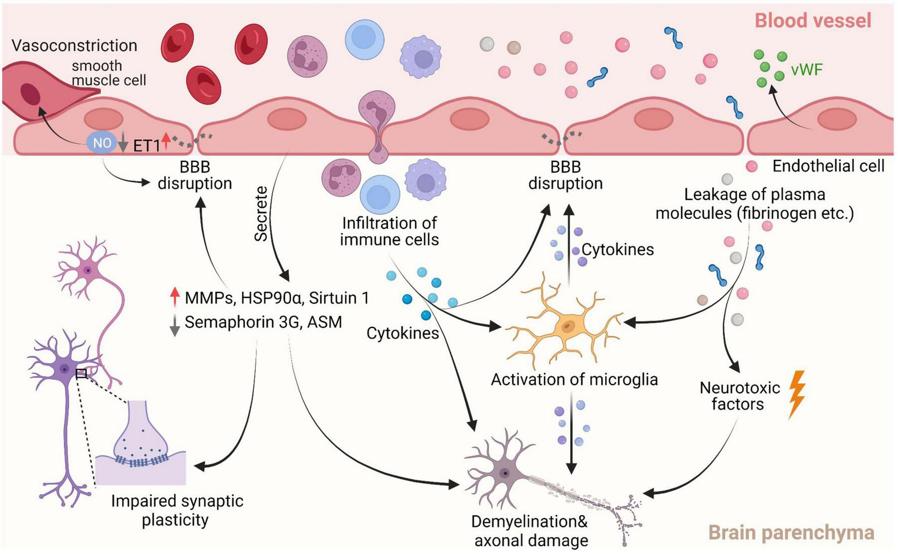 Pathological characteristics of cerebral small vessel disease (CSVD). Of them, decreased nitric oxide (NO) bioavailability is the most commonly used marker of dysfunction in endothelial cells (ECs). Reducing NO levels can lead to less vasodilation of neighboring smooth muscle cells, which in turn causes nitrosylation or nitrosation of tight junction (TJ) proteins, ultimately resulting in BBB disruption. Increased ET1 release by dysfunctional ECs can give rise to pathological vasoconstriction. The reduction of semaphorin 3G and sirt1 due to endothelial dysfunction can affect synaptic plasticity and BBB integrity respectively, and consequently, contribute to cognitive decline. Additionally, the factors secreted by dysfunctional ECs such as von Willebrand factor (vWF), heat shock protein 90α (HSP 90α), acid sphingomyelinase (ASM) and matrix metalloproteinases (MMPs) can induce vessel damage directly, as well as impair the integrity of the BBB and white matter. Compromising the BBB allows for entry of potential detrimental plasma components and immune cells into the brain parenchyma, further promoting BBB breakdown and white mater damage via neuroinflammation and direct neurotoxic effects. Figure created using BioRender.com.