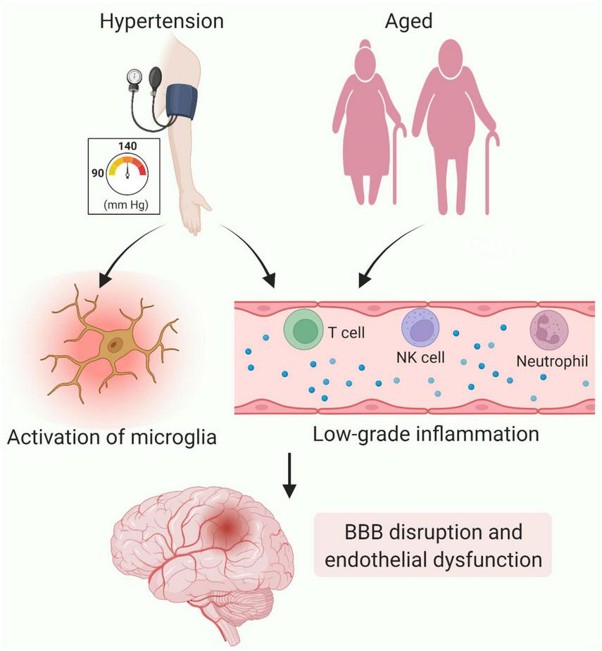 Contributions of inflammation to cerebral small vessel disease (CSVD). Chronic hypertension-induced vascular remolding leads to hypoxia and ischemia of local brain parenchyma, thereby triggering activation of microglia. In addition, hypertension and aging can generate chronic, low-grade inflammation. The inflammatory molecules generated and immune cells recruited as a result contribute to BBB impairment and endothelial dysfunction. Figure created using BioRender.com.