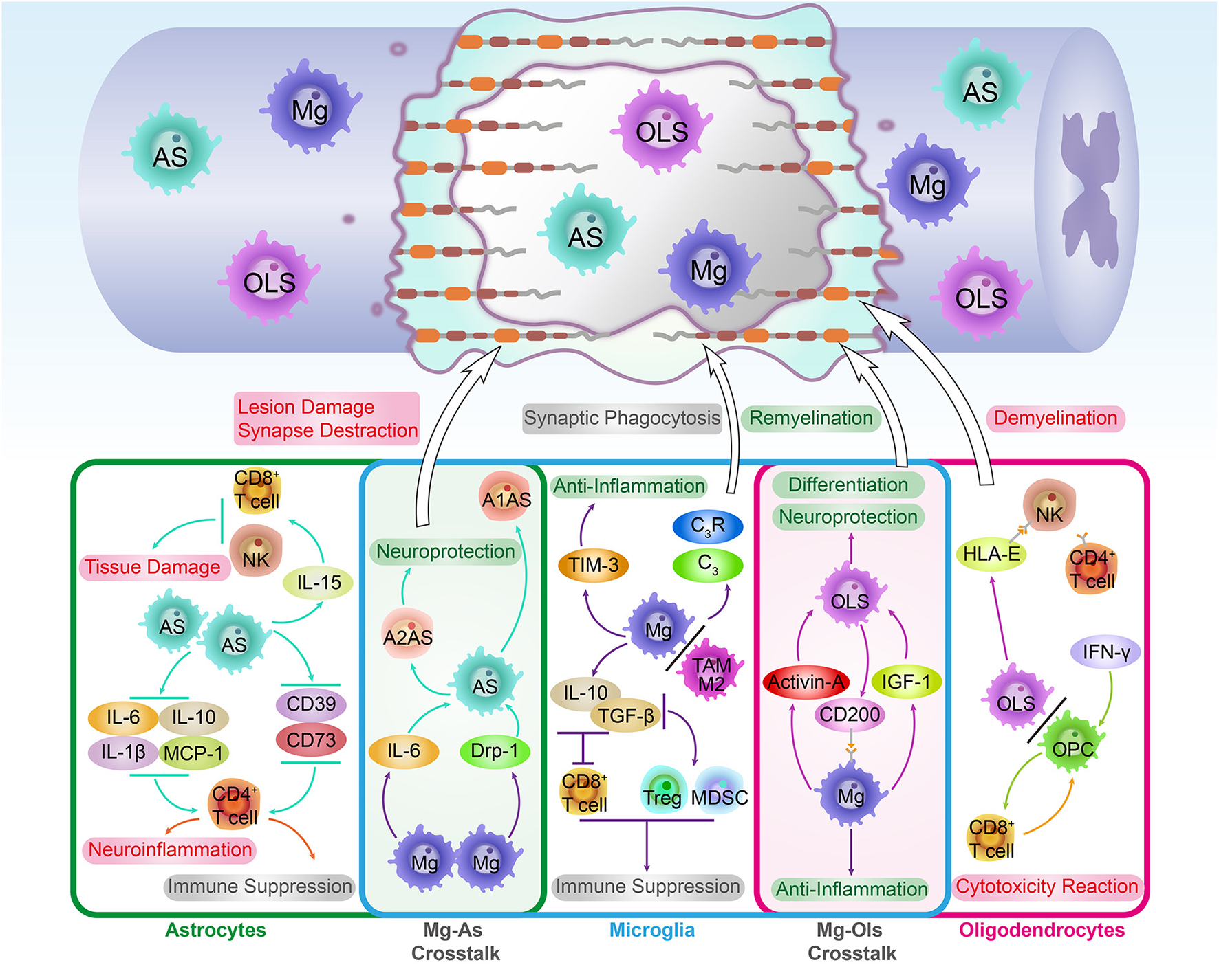 | Oligodendrocytes (OLs) | Typical glial roles:Secretion: | Myelination and trophic supportOMgp, MBP, MAG, MOG, cytokines | • OLs Mediate the NK cells and Th cells via HLA-E, and the immune response will induce the OLs survival and the demyelination (Zaguia et al., 2013). • The oligodendrocyte precursor cells (OPCs) is also antigen presenting cells (APC) cells in CNS (Kirby et al., 2019). • The IFN-γ can be presented to CD8+ T cells and induced the cytotoxicity reaction of CD8+ T cells toward OPC (Kirby et al., 2019). • OLs produced CD200 inhibits the Mg activation induced CNS neuroinflammation (Koning et al., 2009). OMgp and complement inaction modulate the myelin clearance and inflammatory progress (Brennan et al., 2015). |