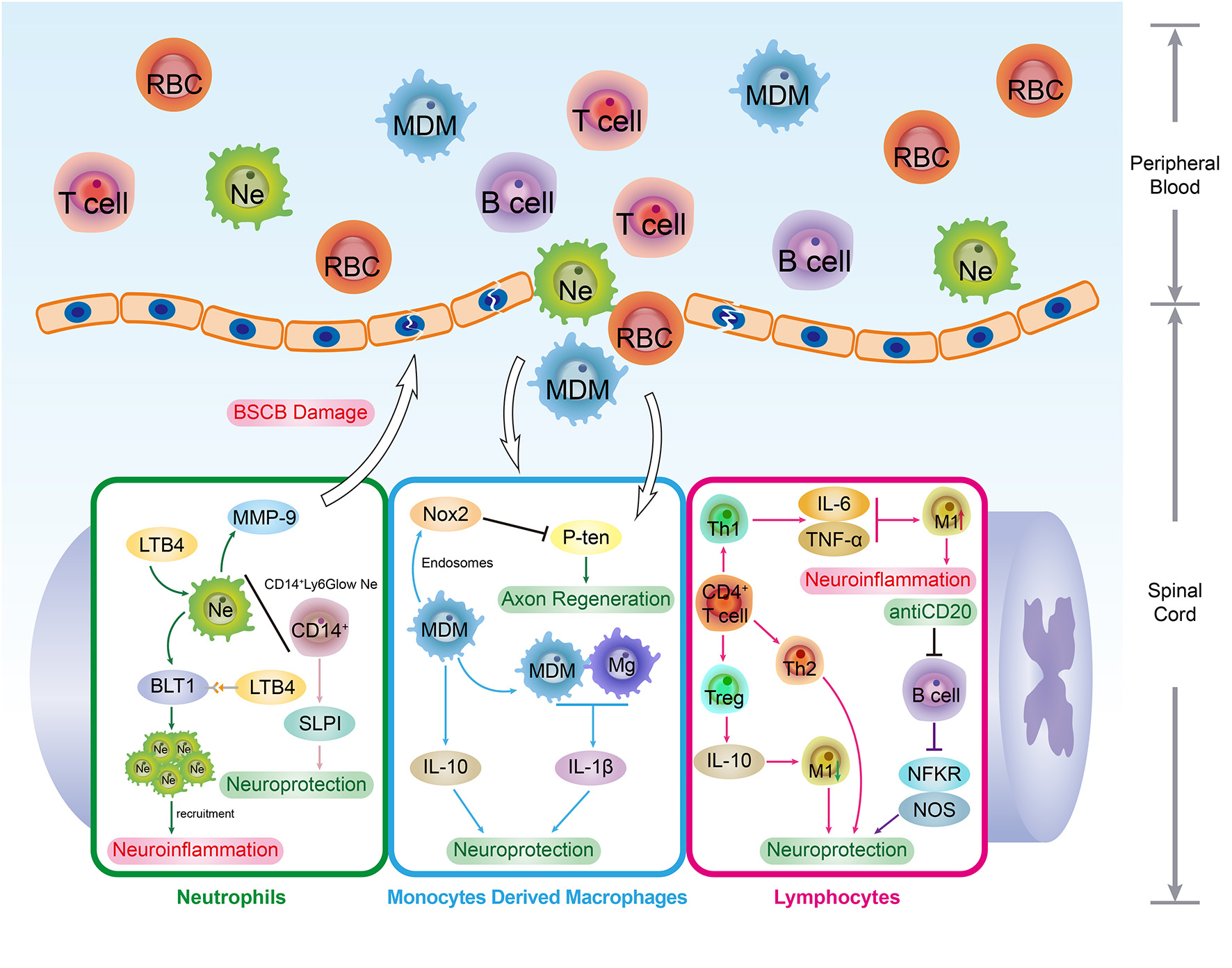 The immune roles of peripheral immune cells. The SCI events not only interrupt the BSCB integrity but break the intraspinal immune homeostasis. With the permeability elevation, peripheral immune cells such as neutrophils (Ne), monocytes derived macrophages (MDM) and lymphocytes are infiltrated in spinal cord lesions. In spinal cord lesions, these peripheral phagocytes. As the typical peripheral phagocytes, Ne and MDM cells also work as immune regulators in CNS. By interacting with immune factors in the spinal cord microenvironment, Ne and MDM played both positive and negative roles in regulating SCI recovery. In addition, the infiltration of lymphocytes enables the adaptive immune response to occur in the spinal cord, which provides significant immunomodulation for SCI pathological repair process. Interestingly, lymphocytes are competent in regulating the phenotype transformation of macrophages. To illustrate, the Th1 cells expressed cytokines such as TNF-α and IL-6 induce the transformation and activation of M1-type macrophages which results in extensive demyelination and neural tissue necrosis.
