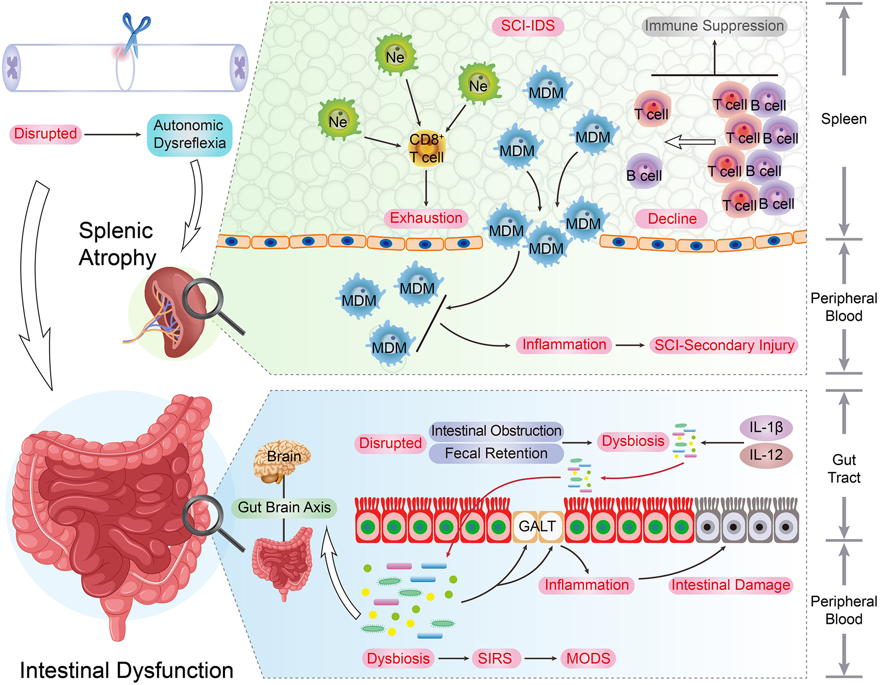 The immune organs and SCI recovery. As the development and storage places of immune cells, immune organs are indispensable for the immune system's smooth and effective operation. The upper spinal cord segment injury led to the autonomic dysreflexia status. Under this circumstance, the excessive norepinephrine and activated β-AR signaling result in adverse spleen dysfunction, such as splenic atrophy and immune cells secretion inhibition, and the quantity of peripheral and splenic CD4+ and CD8+ T cells underwent a decrease post-SCI. In addition, due to the surplus norepinephrine stimulation post-SCI, the immune activity and cytokine secretion capacity of splenic CD8+ T cells were impaired. These changes can be regarded as the typical hallmarks of SCI-IDS. Post SCI, the stress-induced intrinsic enteric nervous system interruption results in intestinal complications such as intestinal obstruction, fecal retention, and infections. As consequence, this situation raises the incidence of dysbiosis and induces immunity dysfunction, systemic Inflammatory response syndrome (SIRS), and multiple organ dysfunction syndromes (MODS). Moreover, the SCI-induced pro-inflammatory cytokines up-regulation (IL-1β and IL-12) takes place in the gut, and the intestinal immune factors disorder condition is parallel with beneficial bacteria reduction extent.