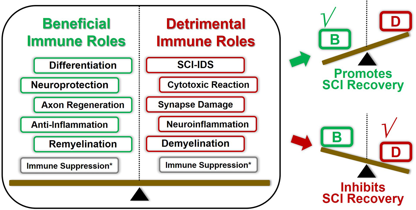 Double-edged immune factors modulate the overall immune landscape SCI recovery. Most of these aforementioned immune factors played both beneficial and harmful roles in regulating SCI pathological repair process. The overall outcomes of SCI pathological repair are the superimposed results of multiple immune elements. For instance, once the beneficial immune roles overcome these detrimental counterparts under certain conditions, the overall immunomodulation tent to promote SCI repair, and vice versa. Consequently, coordinating the panoramic immune landscape of SCI pathophysiological changes will provide us deepening understanding of how immune factors modulate the SCI recovery process. *The immunosuppression effects could be both beneficial and detrimental toward SCI recovery, which presents various characteristics due to the spatiotemporal difference.