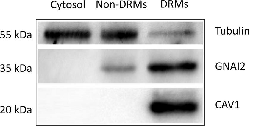 Western blot analysis of Tubulin, GNAI2, and CAV1 proteins in cytoplasmic (Cytosol.), non-detergent-resistant membrane (Non-DRMs), and DRM preparations collected from ARPE19 cell homogenates during successive detergent extraction. Five micrograms of proteins from each preparation were loaded on SDS-PAGE, separated, electro-transferred, and immunoblotted with antibodies against the indicated proteins. The micrographs presented were representative of three independent experiments.