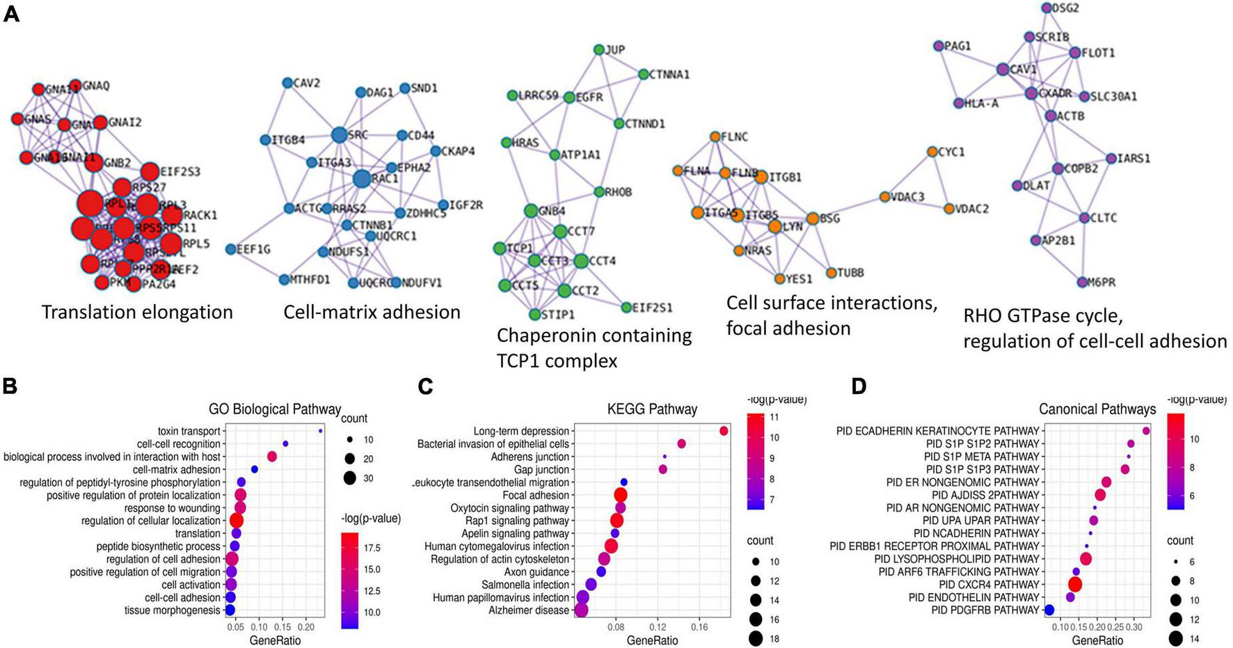 To minimize false-positive results, we set the confidence level of higher than 95% for peptide selection and the false positive rate (FDR) of lower than 1% for protein identification. We also included a mock-treated control at the thioester cleavage step (HA treatment) to identify the non-specific binding of HPDP-biotin in each experiment. Peptides identified in the HA-treated group that were also in the mock-treated group were removed. The results of two independent experiments were compared and the peptides and proteins identified from both experiments were taken as the final potentially palmitoylated targets. In total, we found 312 peptides with palmitoylation site(s), which corresponded to 192 proteins. For a complete list of the proteins and the corresponding peptides, please see Supplementary Table 1. We checked these potential palmitoylation sites against the SwissPalm database3 and found 75 peptide sequences that correspond to 55 proteins that were not reported by other groups previously. These peptides were listed in Table 1. Among these proteins are immunoglobulin heavy chain proteins (IGHG2, IGHG3, IGHG4, and IGHM), integrin subunits (ITGB5 and ITGB6). We also identified several palmitoylation target proteins which may have specific functional effects on RPE cells. For example, we found that SLIT3, a transcriptional factor involved in neurogenesis and retina neovascularization was palmitoylated (Ringstedt et al., 2000; Zhou et al., 2017). Another example is oxytocin receptor OXTR. Oxytocin is a nonapeptide that was found in the extracellular matrix of cone photoreceptors (Halbach et al., 2015). Studies have shown that upon binding of oxytocin, OXTR on RPE cells activates a signaling pathway that leads to increased intracellular calcium concentration, and is possibly related to RPE cell trans-activation (Halbach et al., 2015; York et al., 2017; Tsuji et al., 2020).
