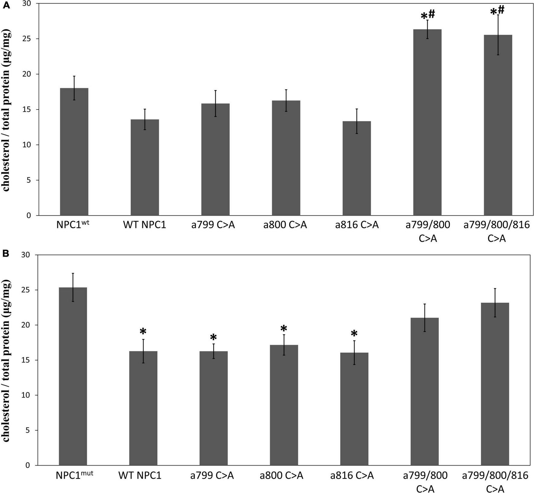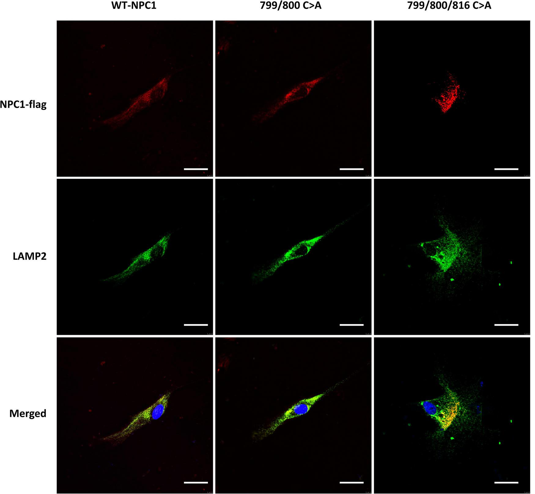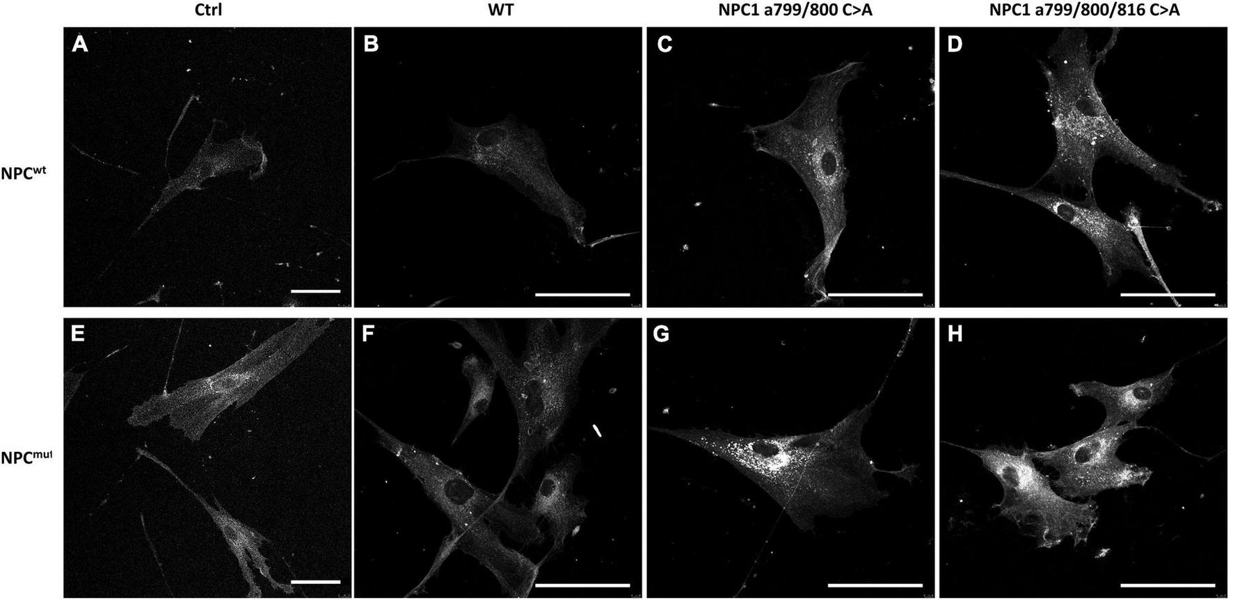 The wildtype (NM_000271) and mutational NPC1 cDNAs were synthesized and the sequences were verified (Genscript, Nanjing, China). All mutated cDNAs were cloned into pcDNA3.1+ and used to transiently transfect the NPC1 deficient (NPC1mut, GM03123) and control (NPC1wt, GM05659) fibroblasts using Lipofectamine 3000 (Invitrogen, Thermo Fisher Scientific). The cells were used 3 days after transfection.