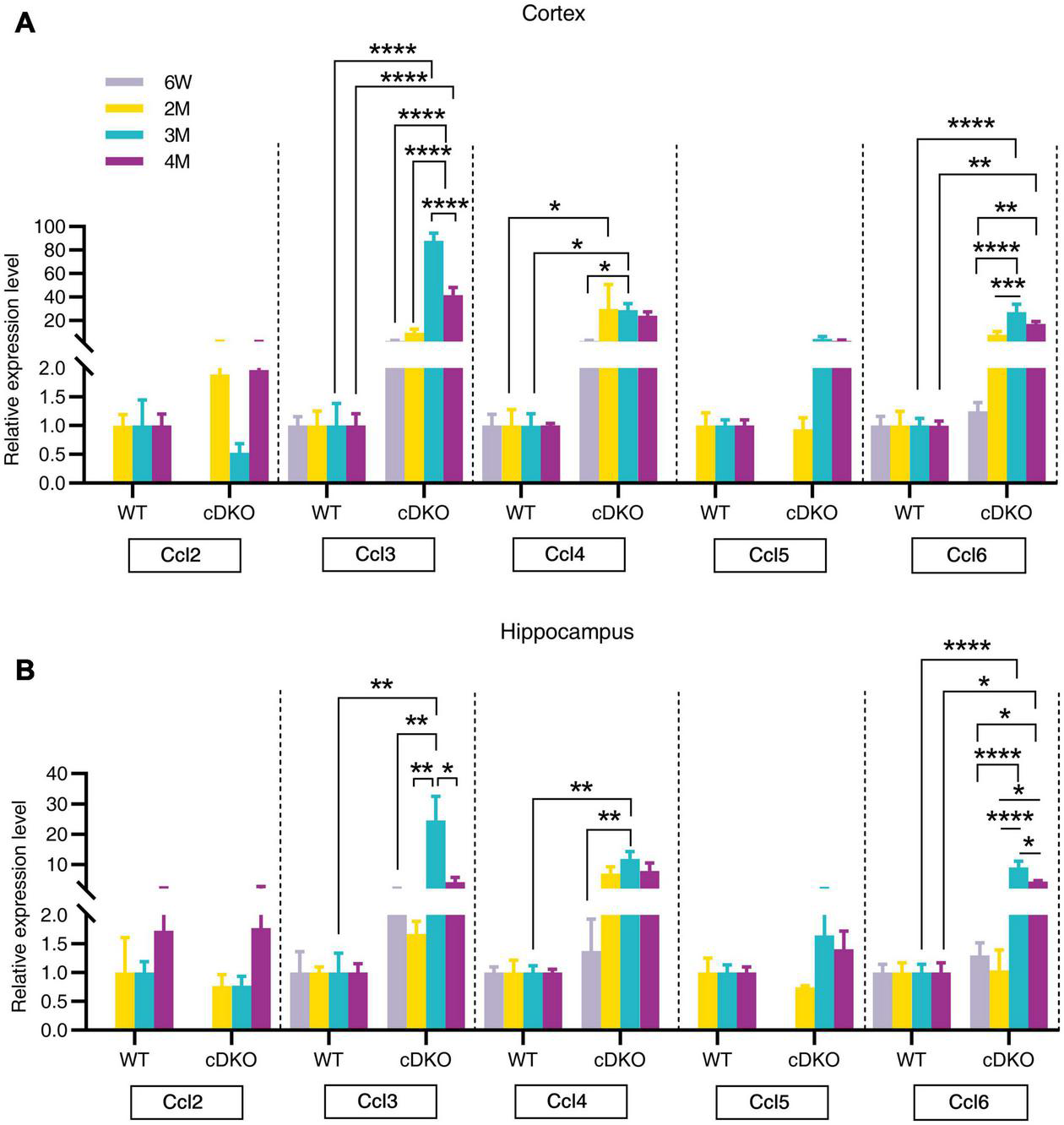 Age-related increase in mRNA expression of chemokine genes in the cortex and hippocampus of cDKO mice. (A,B) Relative expression of chemokine gene Ccl2, Ccl3, Ccl4, Ccl5, and Ccl6 normalized to GAPDH in the cortex (A) and hippocampus (B) of WT and cDKO mice at the ages of 6 weeks, 2, 3, and 4 months analyzed by RT-PCR. Data are presented as the mean ± SEM (n = 3–5 for each group). One-way ANOVA analysis followed by Turkey’s test, *p < 0.05, **p < 0.01, ***p < 0.001, ****p < 0.0001.